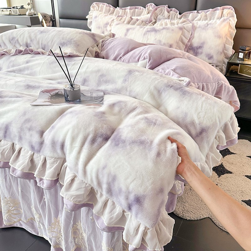 加厚高端兔毛绒牛奶绒q夹棉床裙四件套加绒保暖被套公主风床上冬