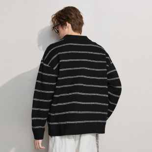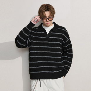 ALLIN 含羊毛条纹假两件毛衣男春秋情侣慵懒风POLO翻领保暖针织衫