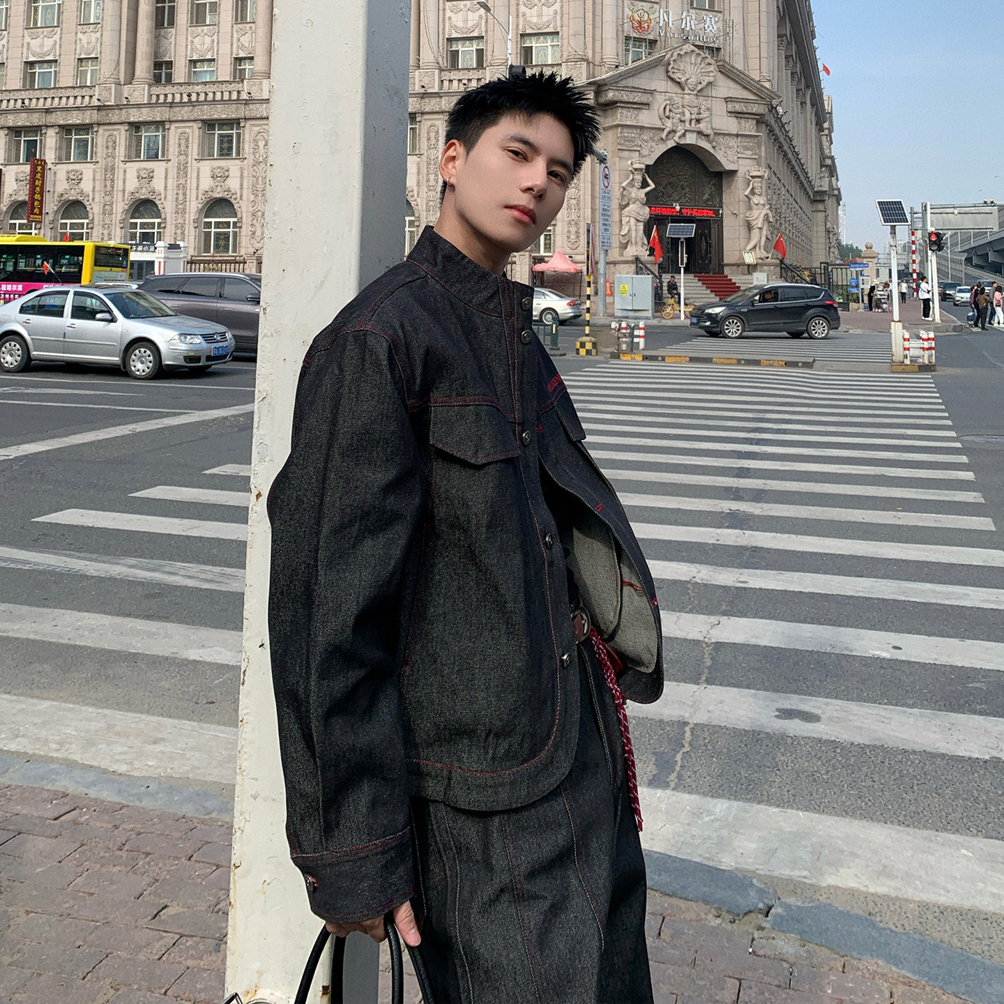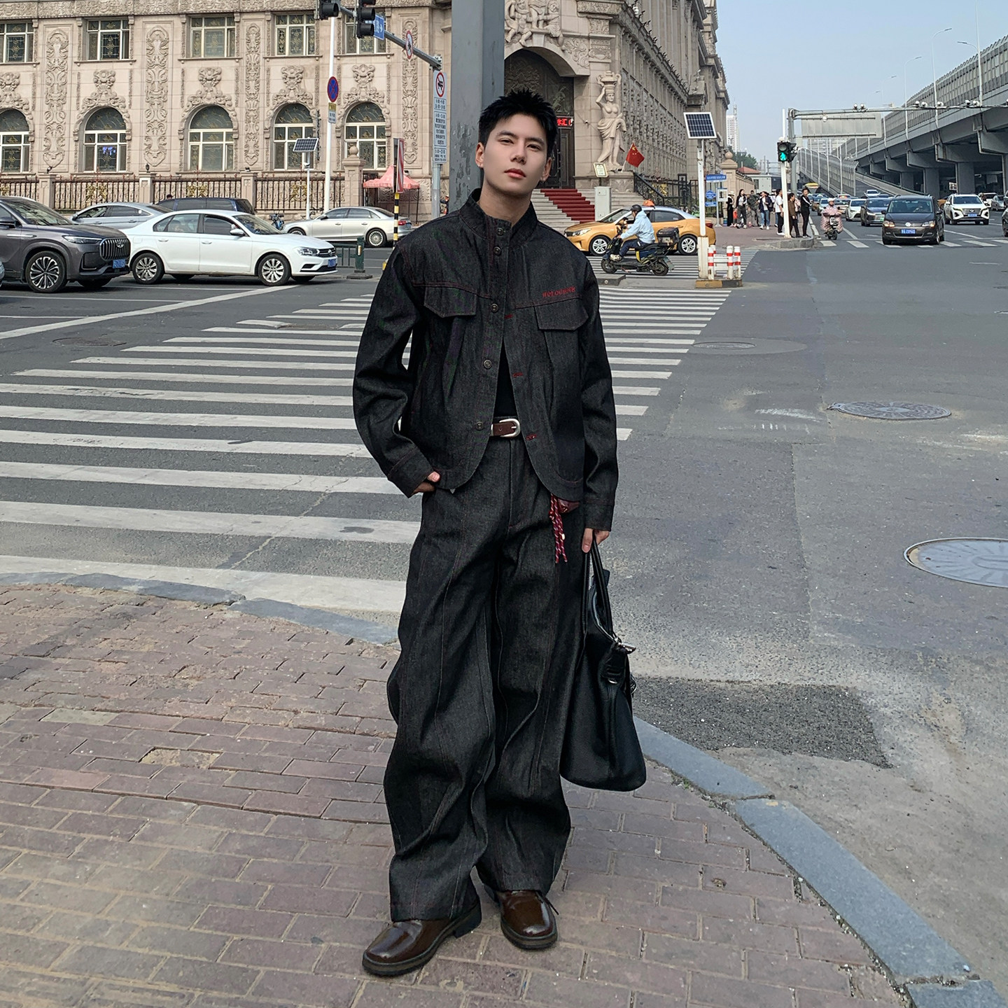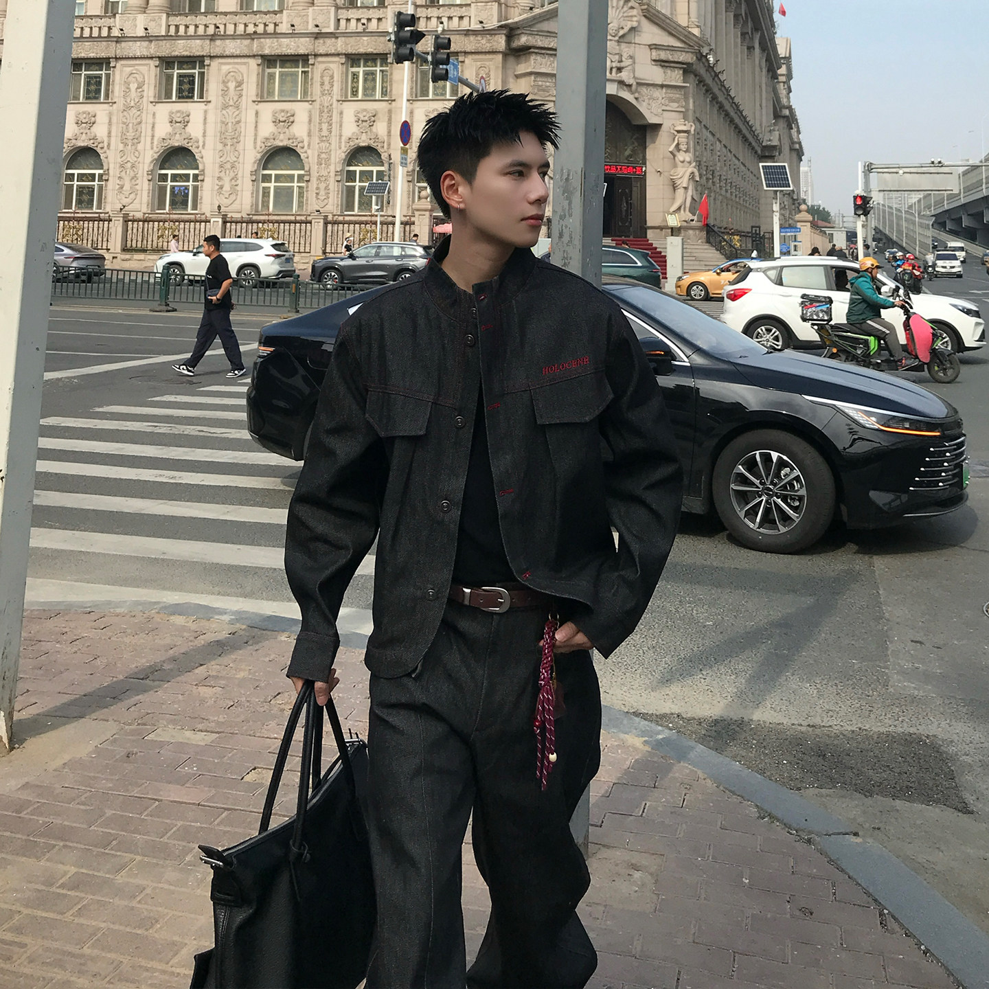 子搭配一套 男外套裤 Holocene美式 潮牌复古设计感水洗做旧牛仔套装