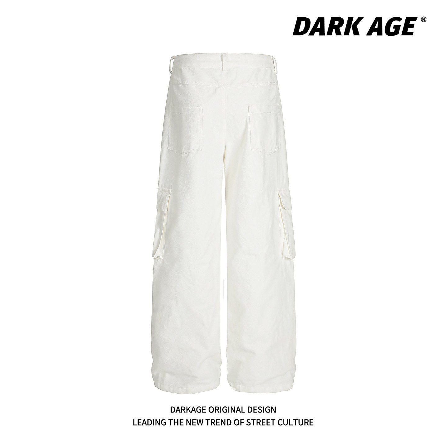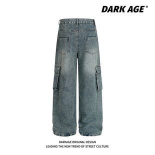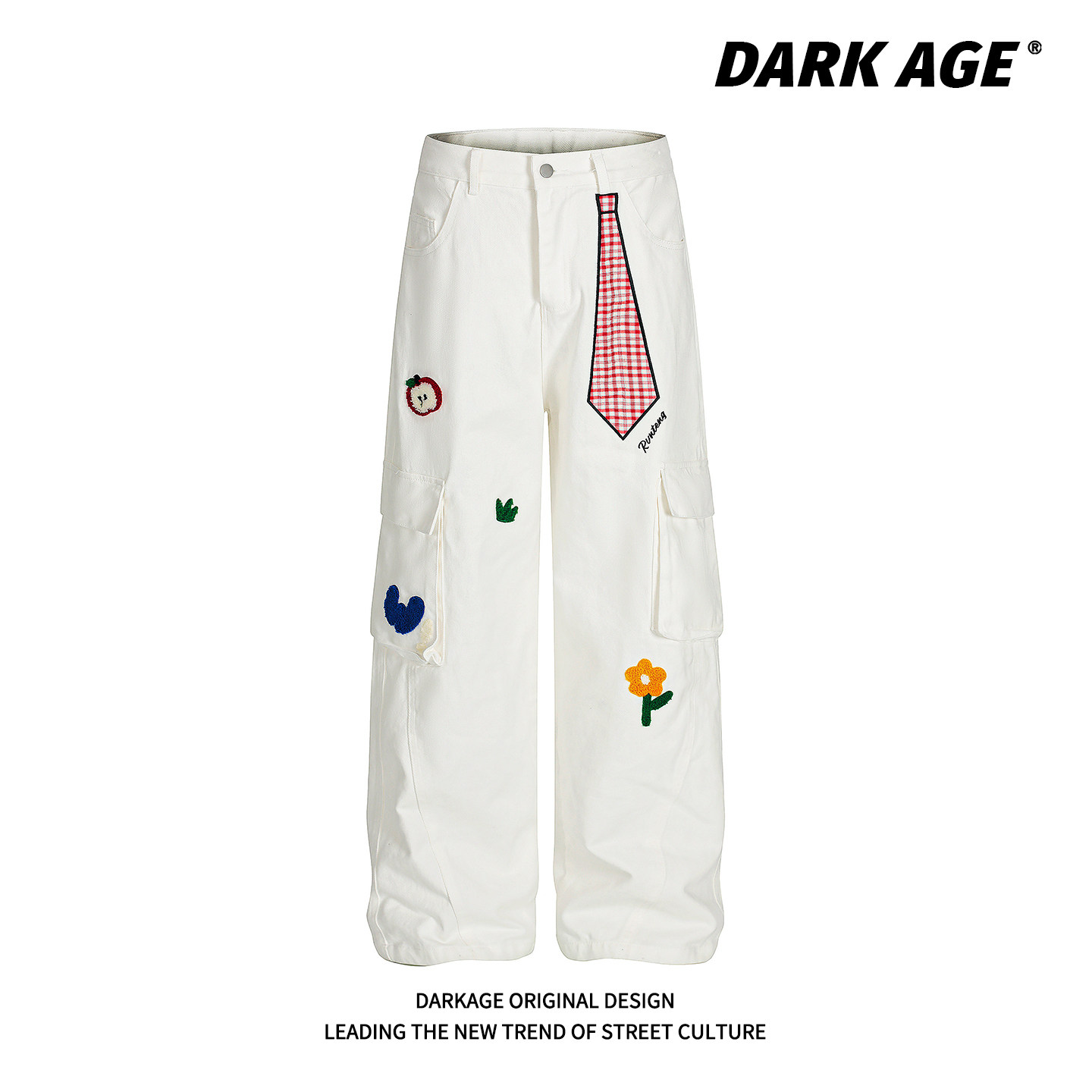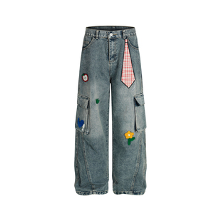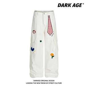 DARKAGE原创创意趣味刺绣格纹领带多口袋工装 女秋宽松直筒 牛仔裤