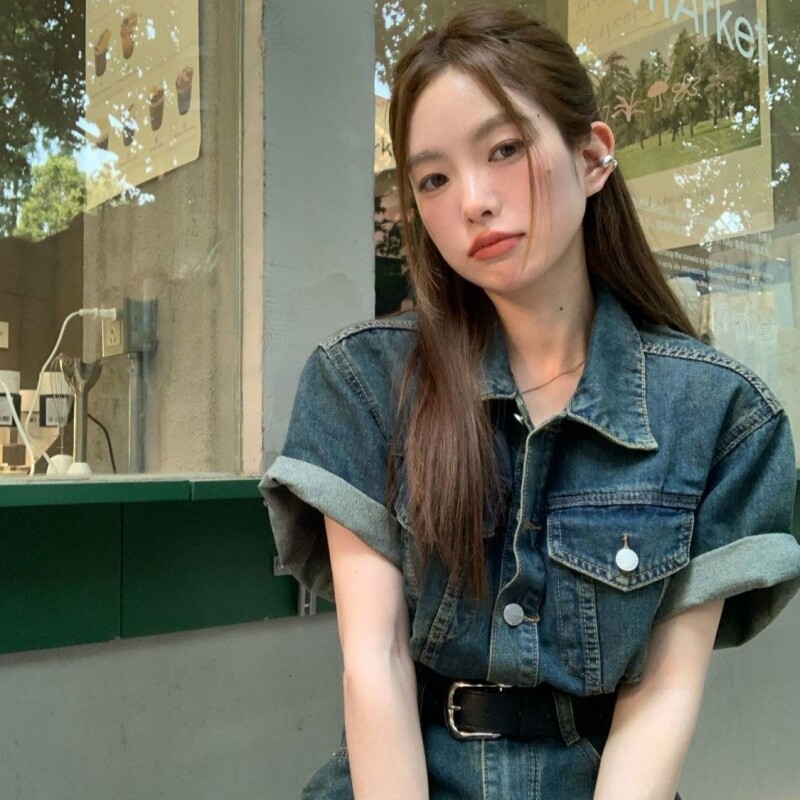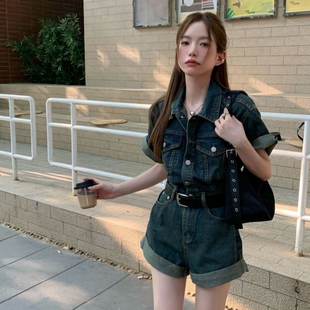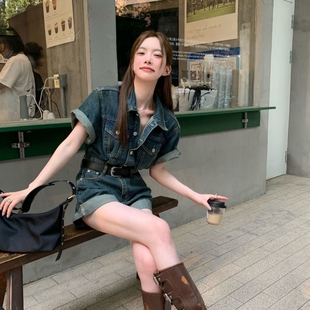 休闲宽松蓝色收腰显瘦短裤 新款 女夏季 港味复古风牛仔polo领连体裤