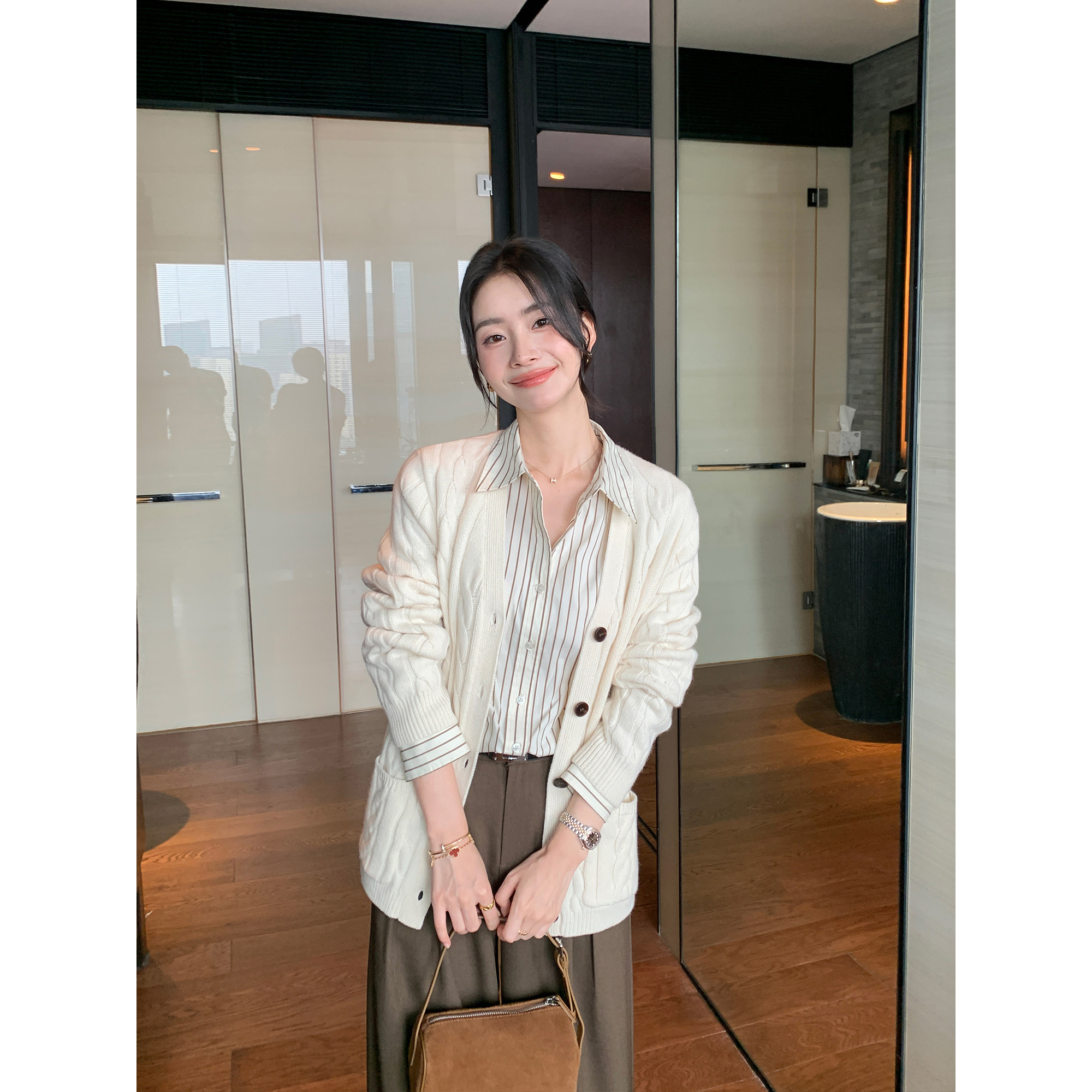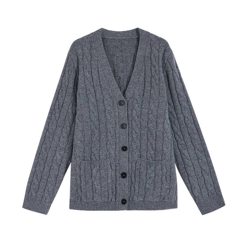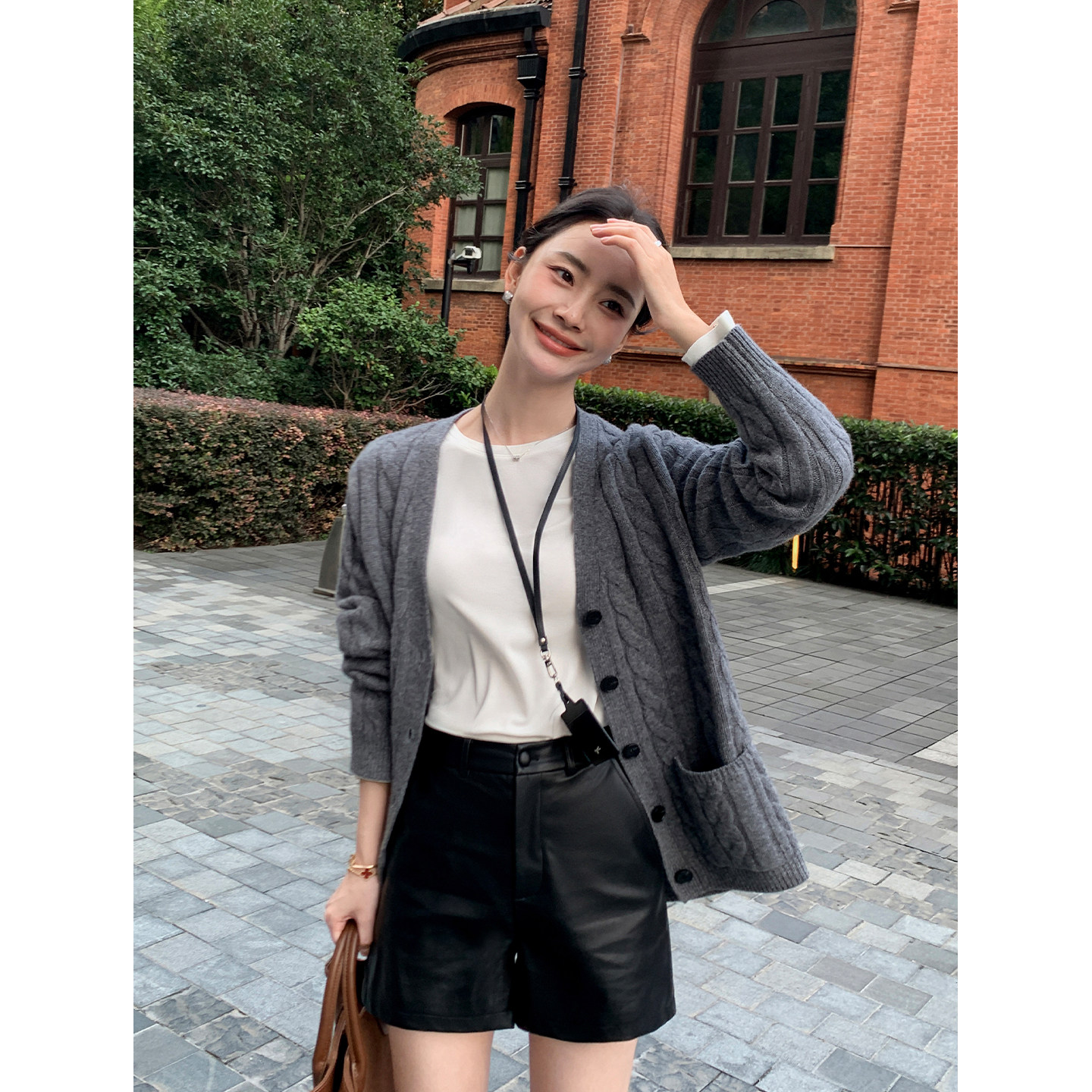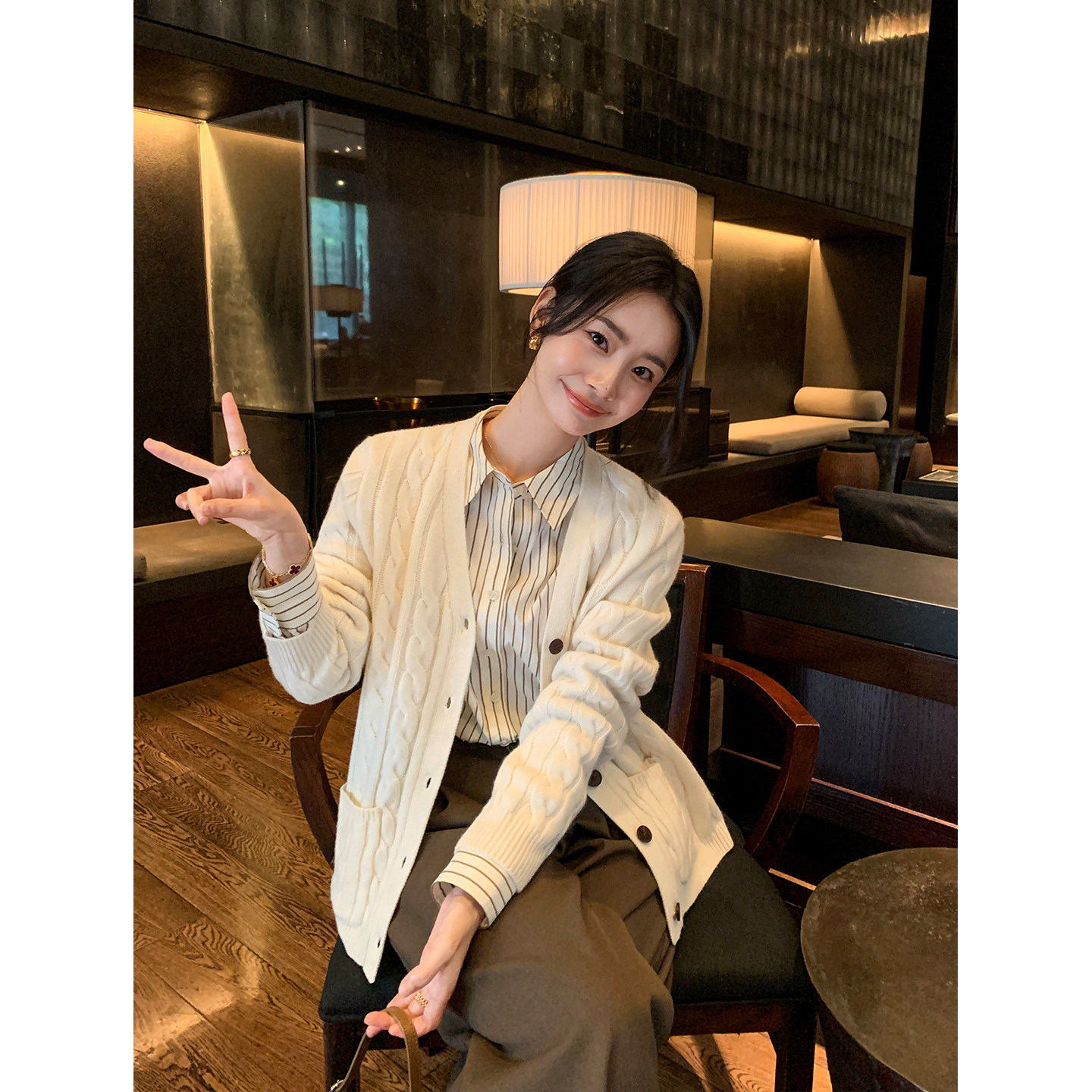 1OO羊毛v领毛衣开衫 智性学究感 女宽松麻花针织小外套 Lin Maven