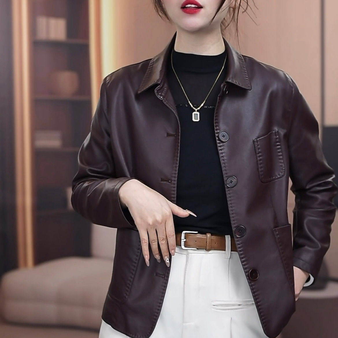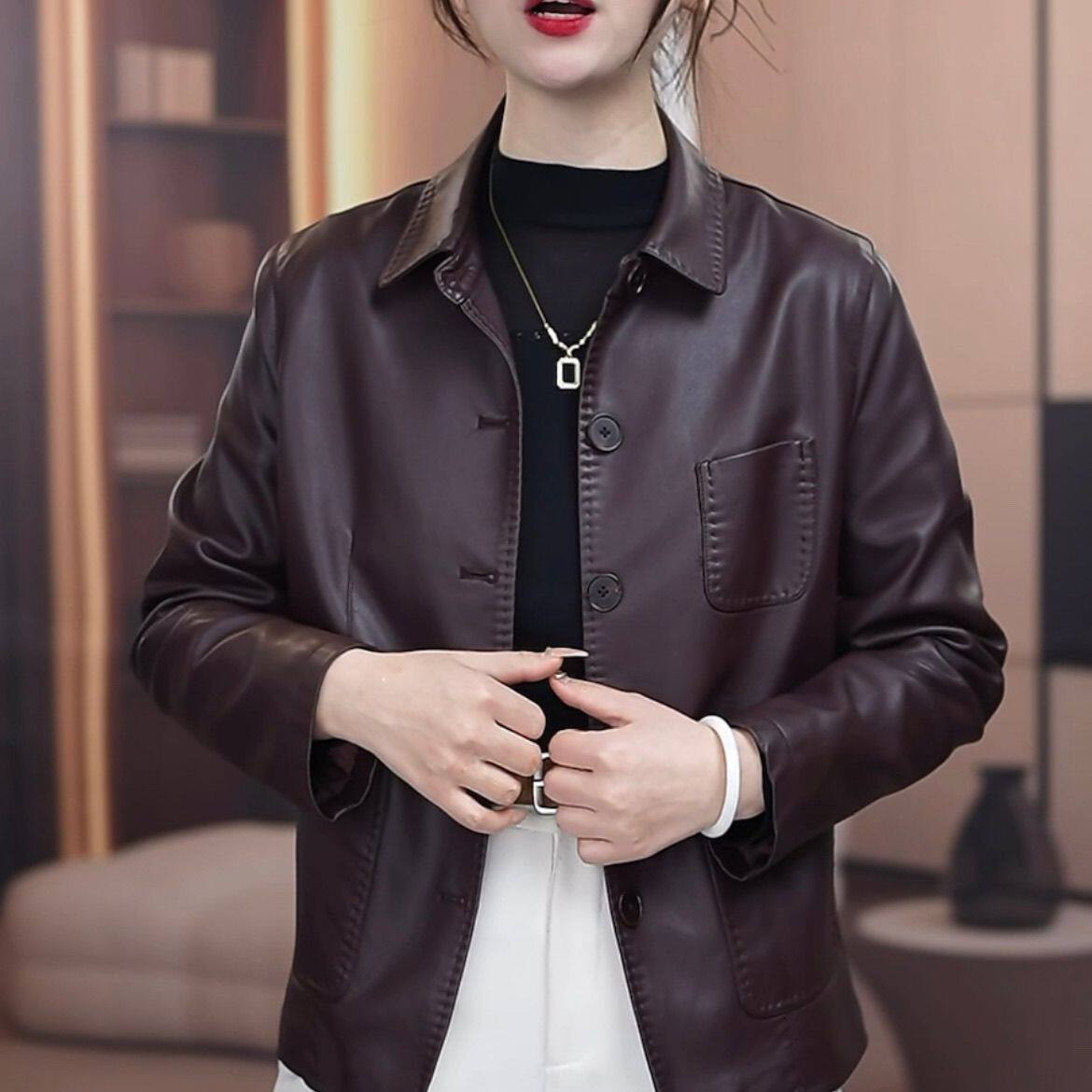 翻领宽松休闲短款 洋气时尚 百搭皮夹克 新款 海宁皮衣外套女2025秋季