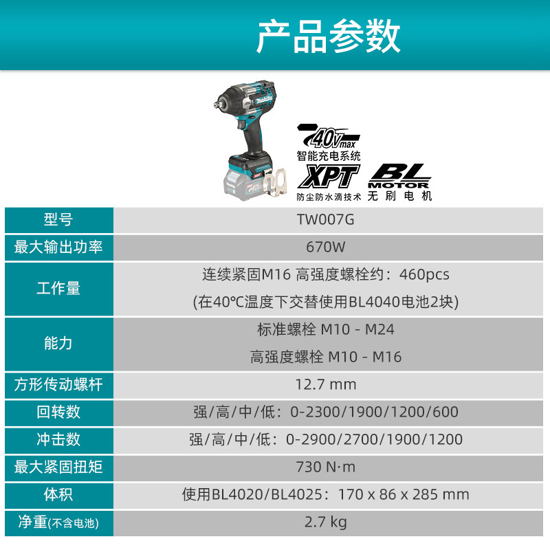 牧田冲击扳手TW007G充电式 大扭力大功率架子工风炮40V锂电动工具