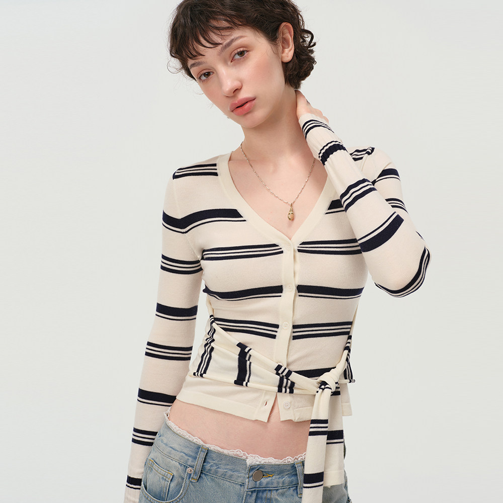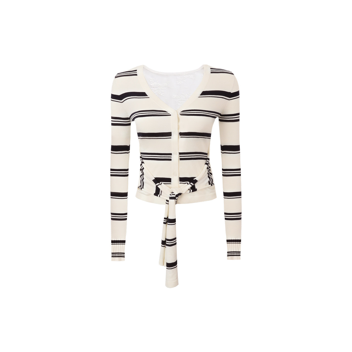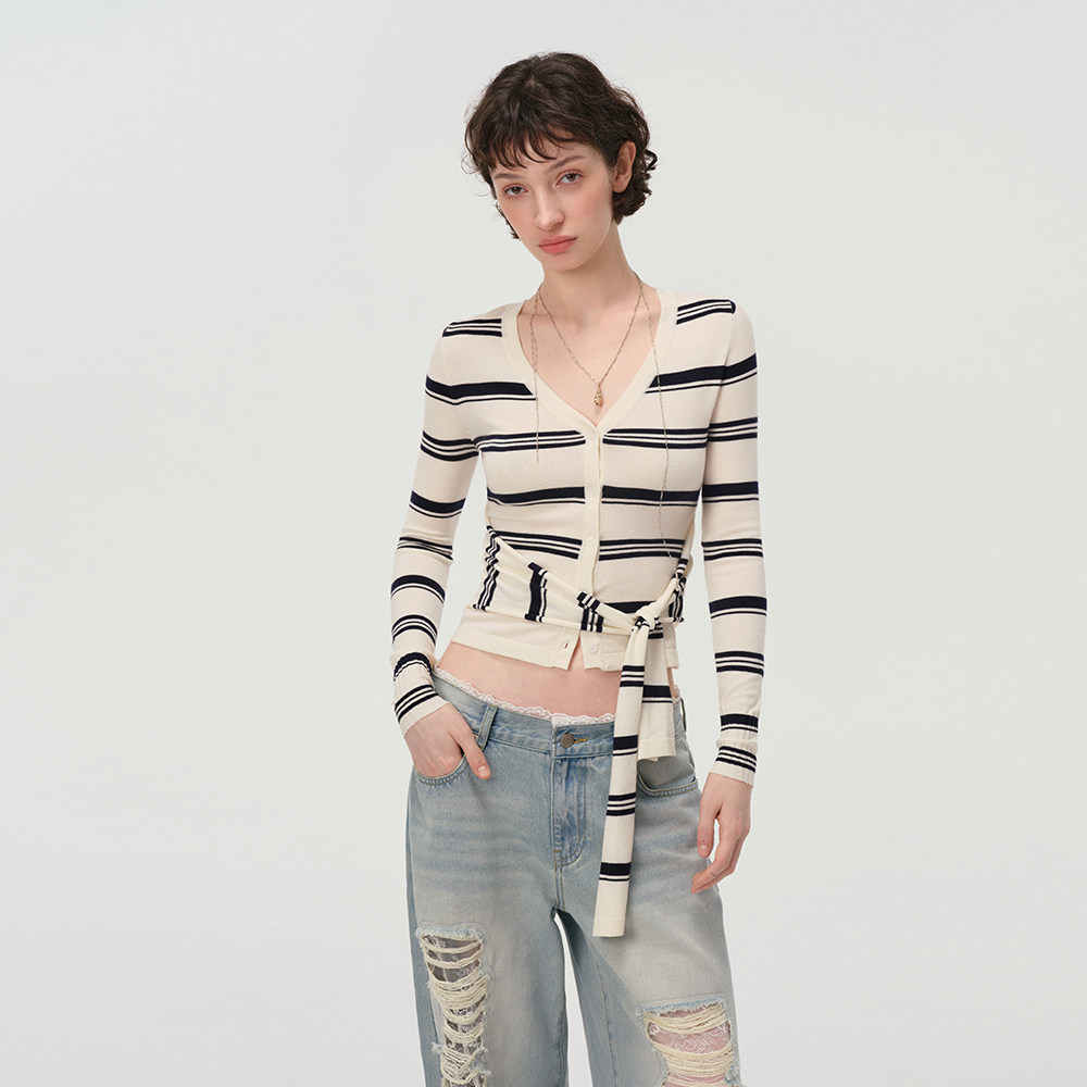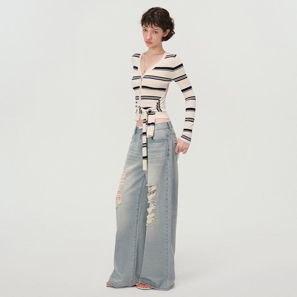 收腰短款 辣妹设计感修身 蕾丝拼接针织黑白条纹上衣春 Studio Mess