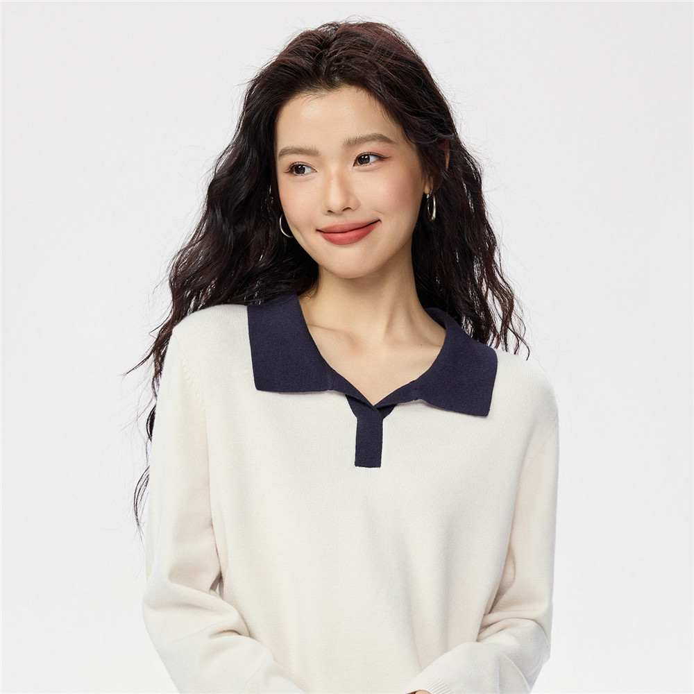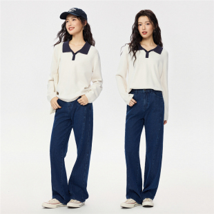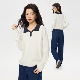 新款 女春季 撞色翻领宽松套头针织上衣女13355784 针织衫 佐丹奴长袖