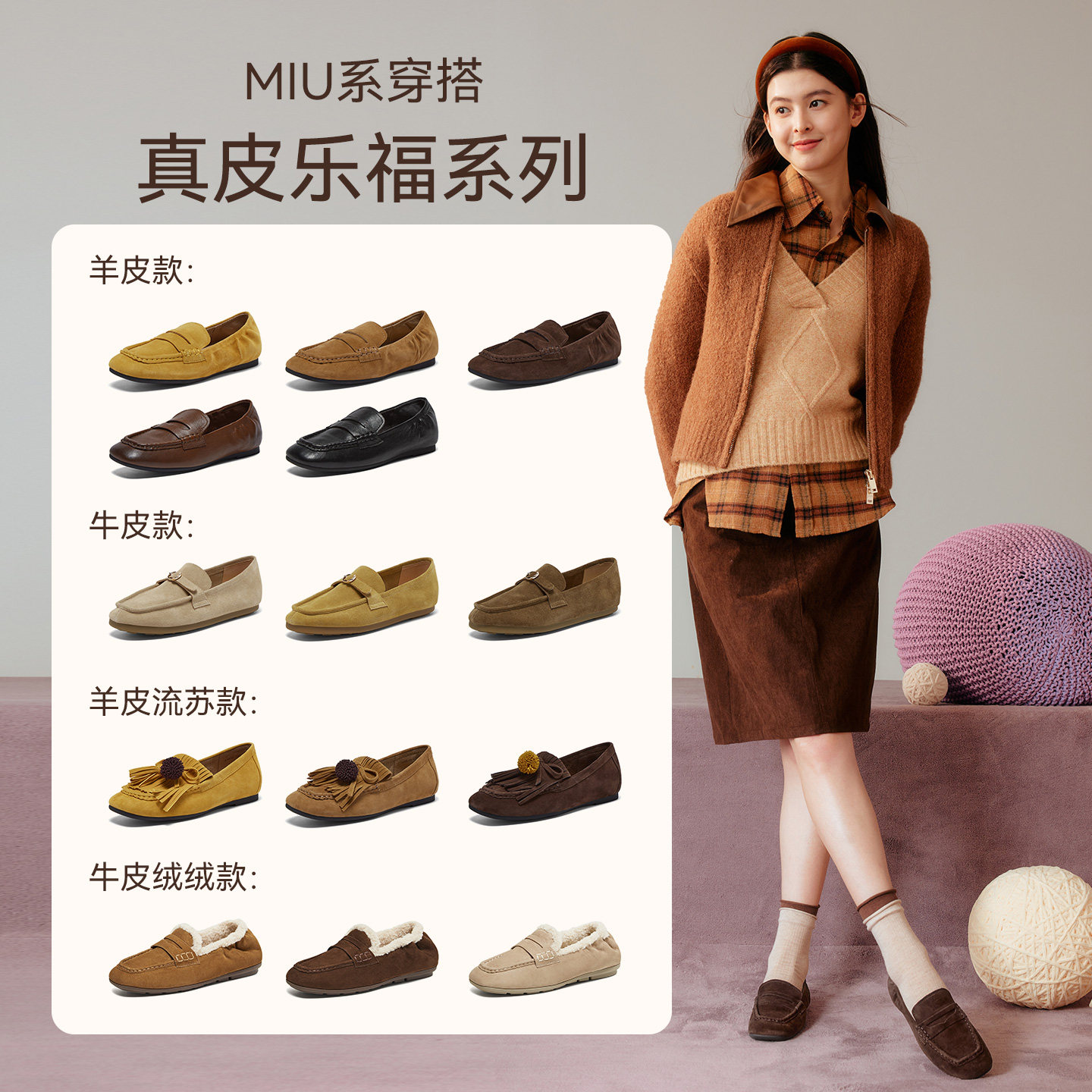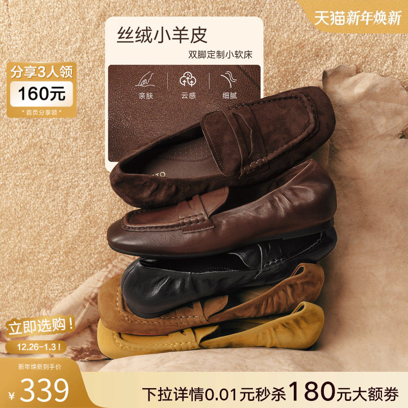 女单鞋 百思图26春新款 英伦豆豆鞋 miu系乐福鞋 UXE01AA6 绒面羊皮鞋