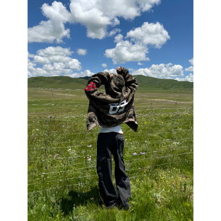 男女潮流街头百搭宽松外套ins 复古刺绣迷彩连帽卫衣开衫 F383 美式