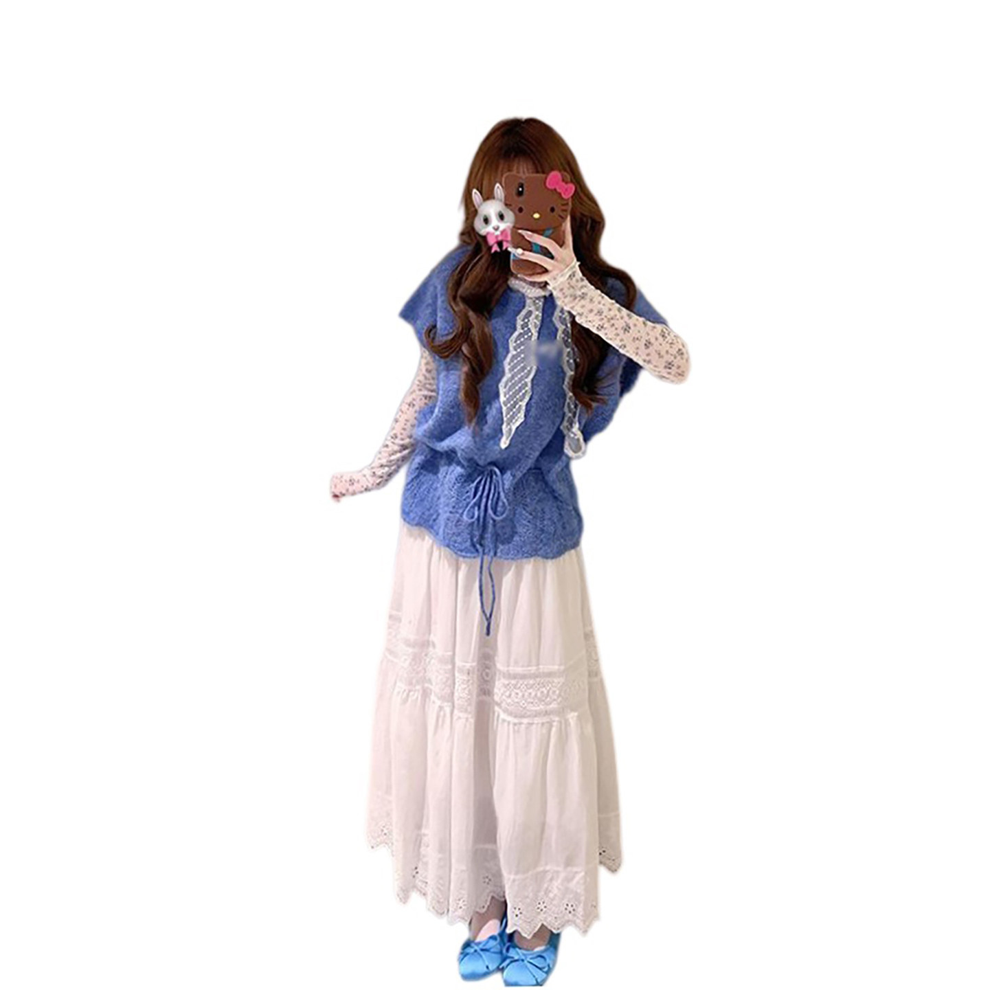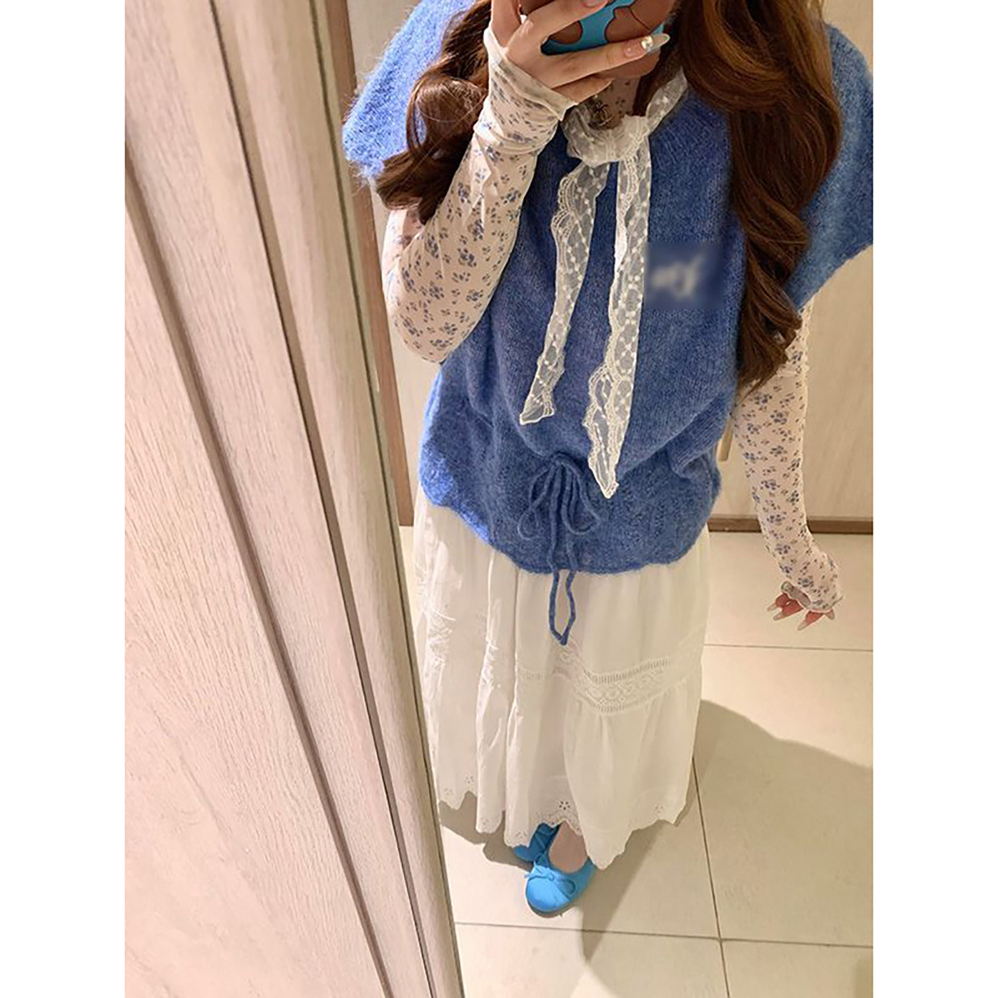 早春甜美少女感蓝色针织毛衣内搭碎花打底衫 高腰半身裙三件套装