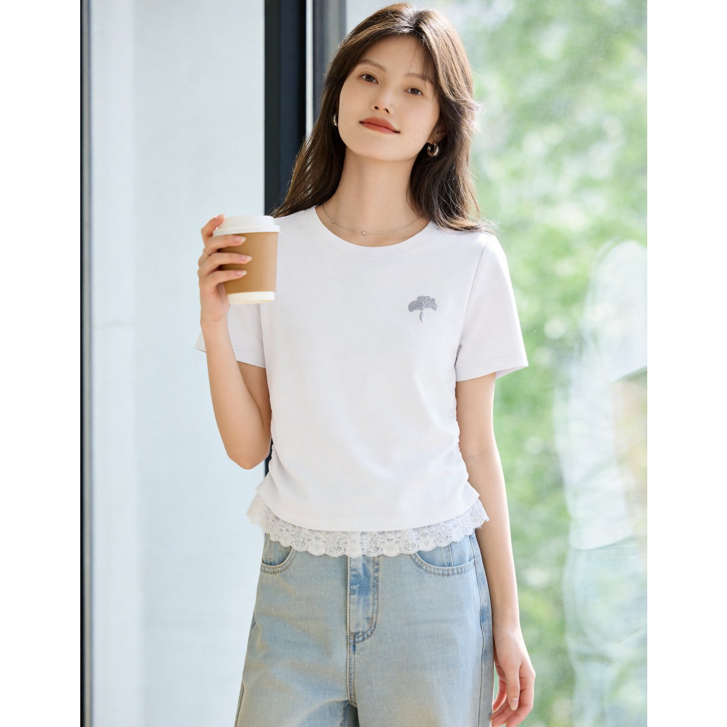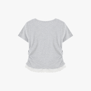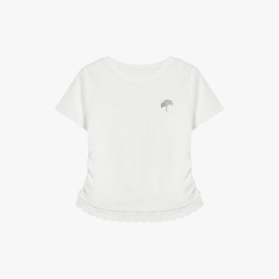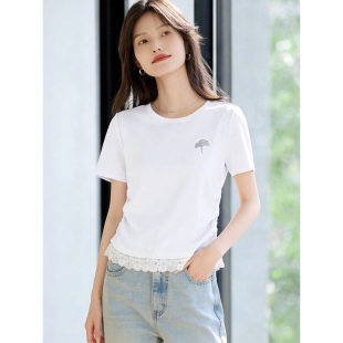 收腰显瘦刺绣设计感上衣 新款 百家好温柔风蕾丝拼接短袖 T恤女春季