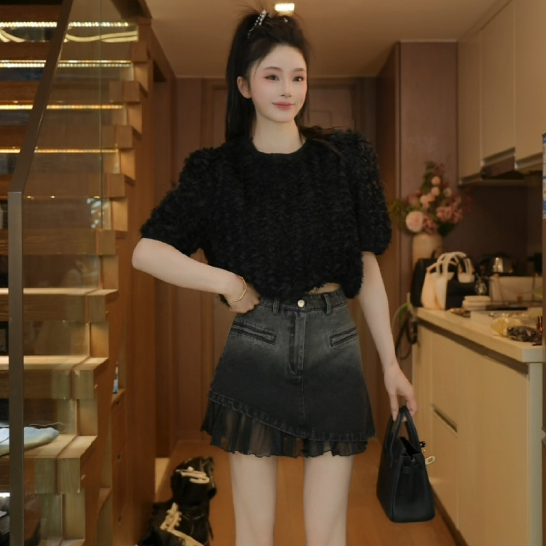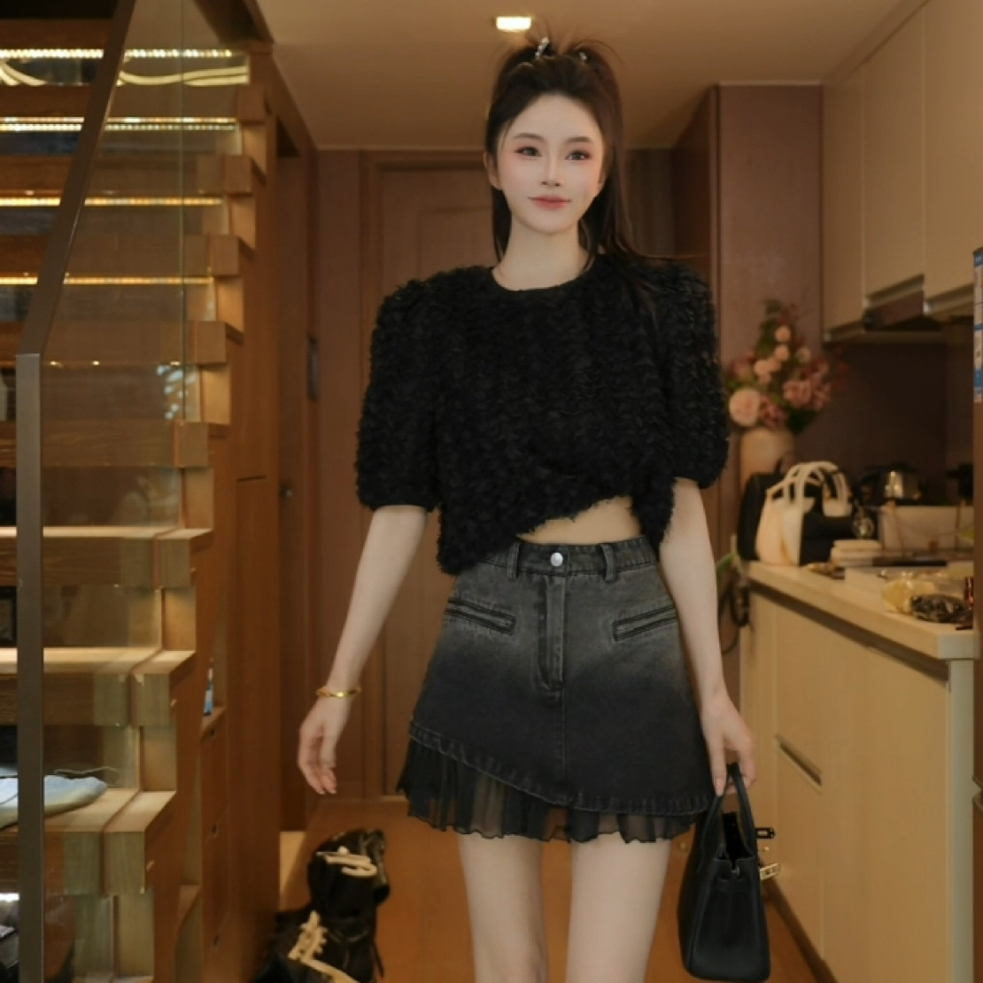 春季 牛仔短裙 荷叶边拼接牛仔半身裙高腰88261 网球少女 磊磊