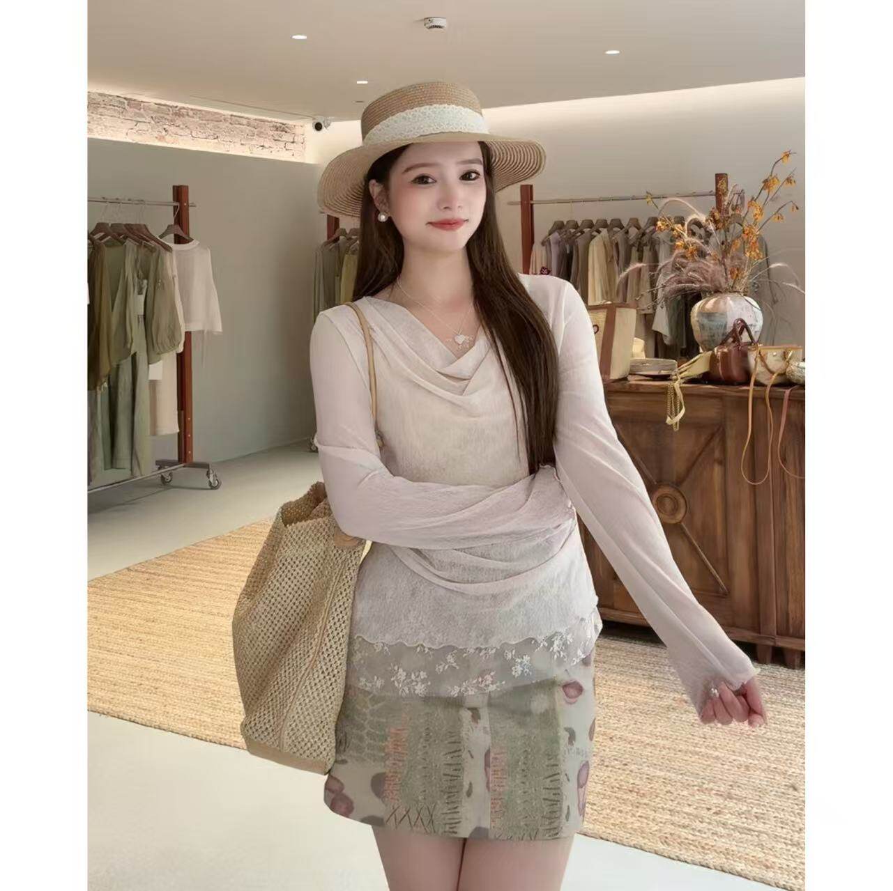 法式 温柔荡领拼接蕾丝收腰显瘦小衫 DIGM 15785 QIQI绮绮家