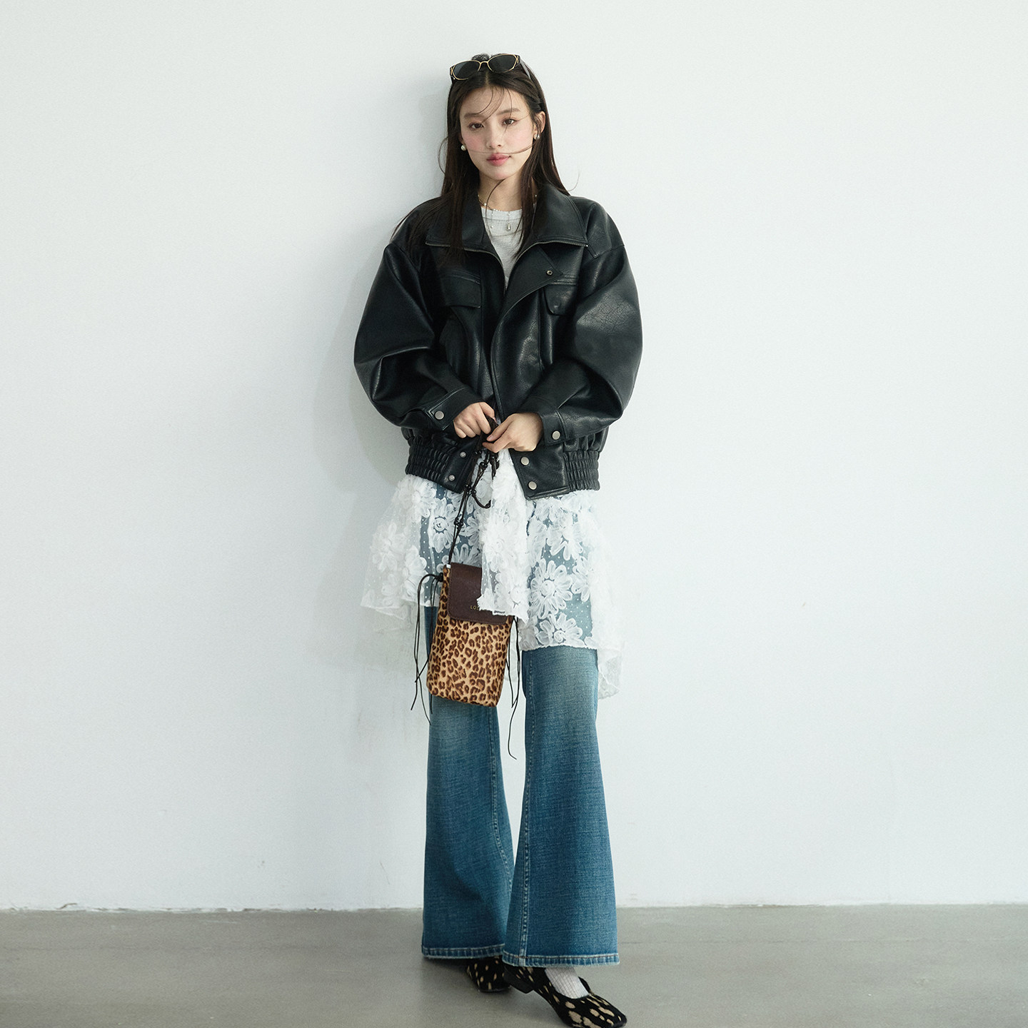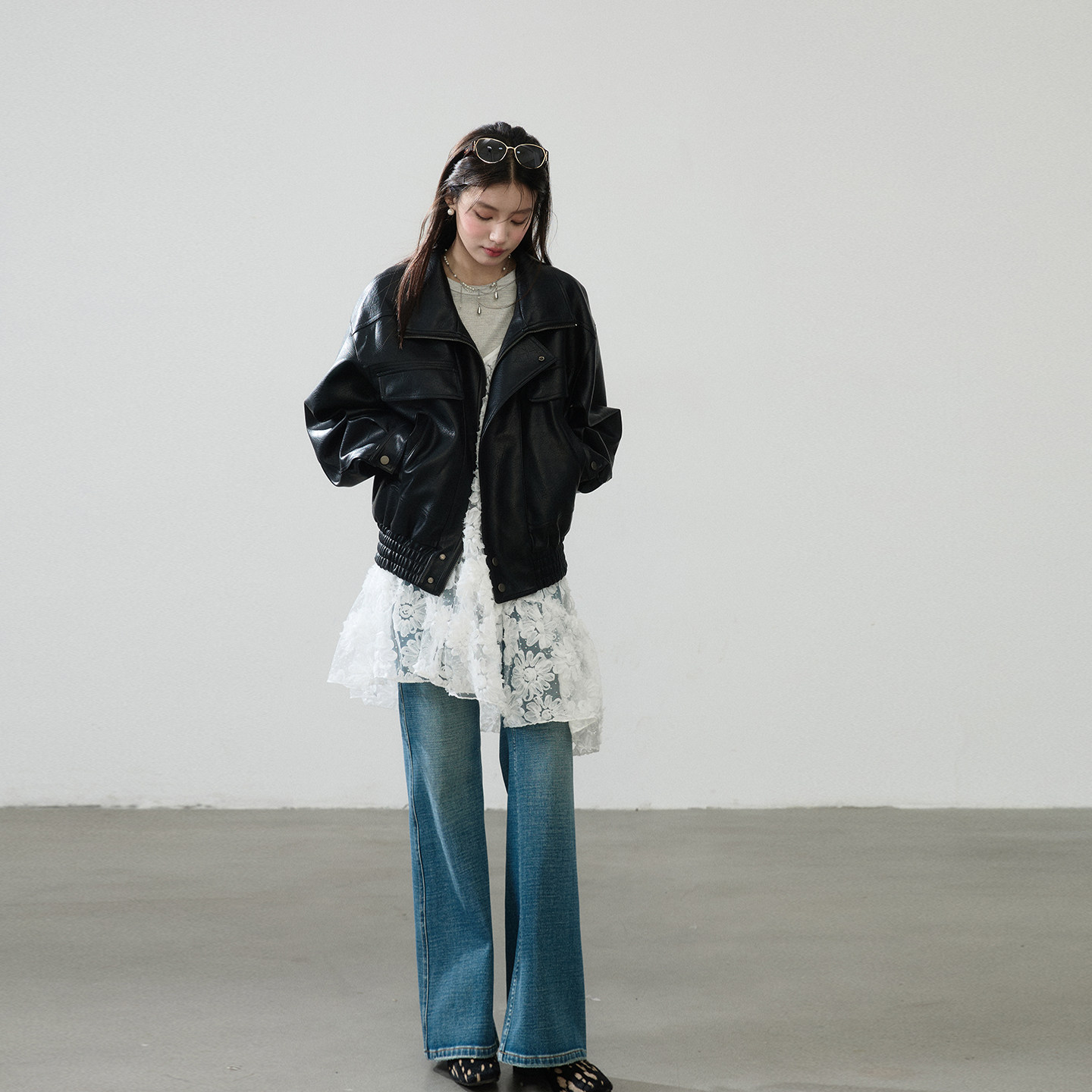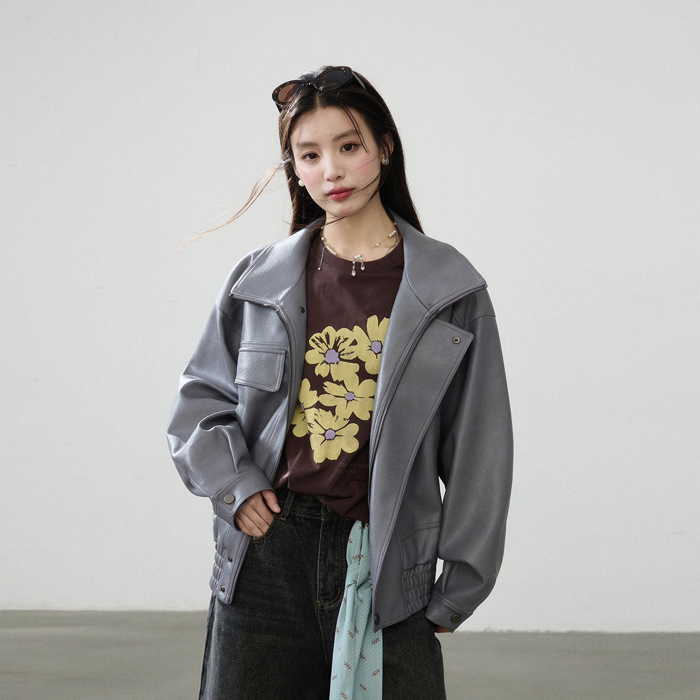 猫酱紫 休闲拉链pu皮衣 三色复古酷飒风机车外套女翻领宽松美式