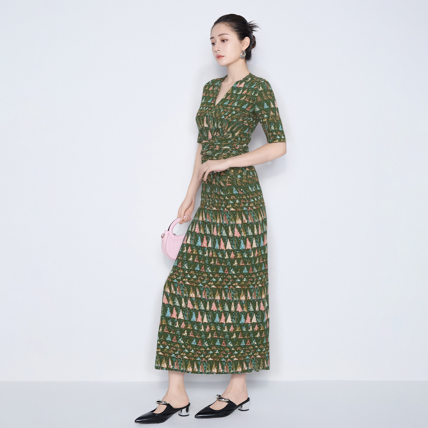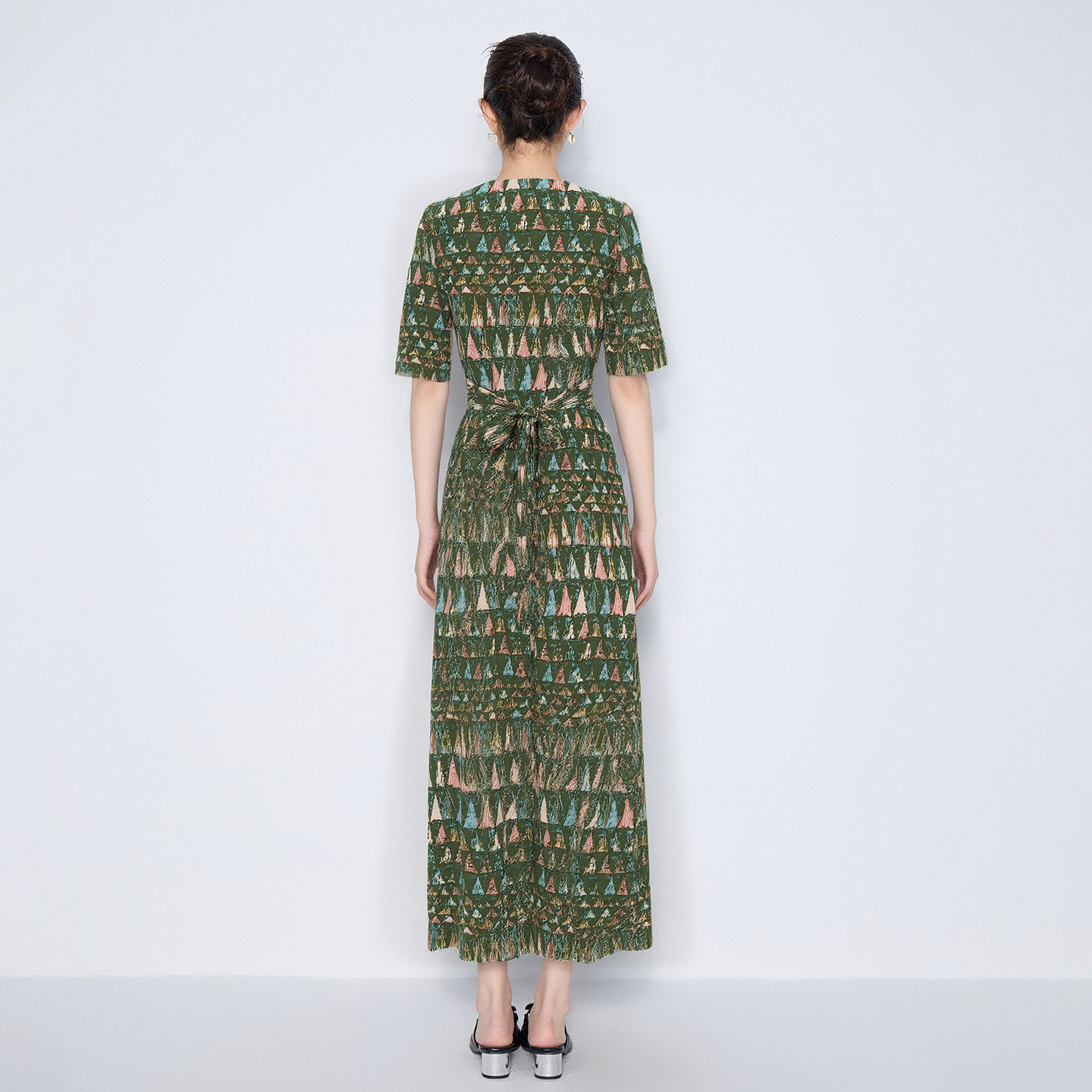 马天奴2026春夏新款 女 绿色印花V领绑带收腰连衣裙子长裙气质法式
