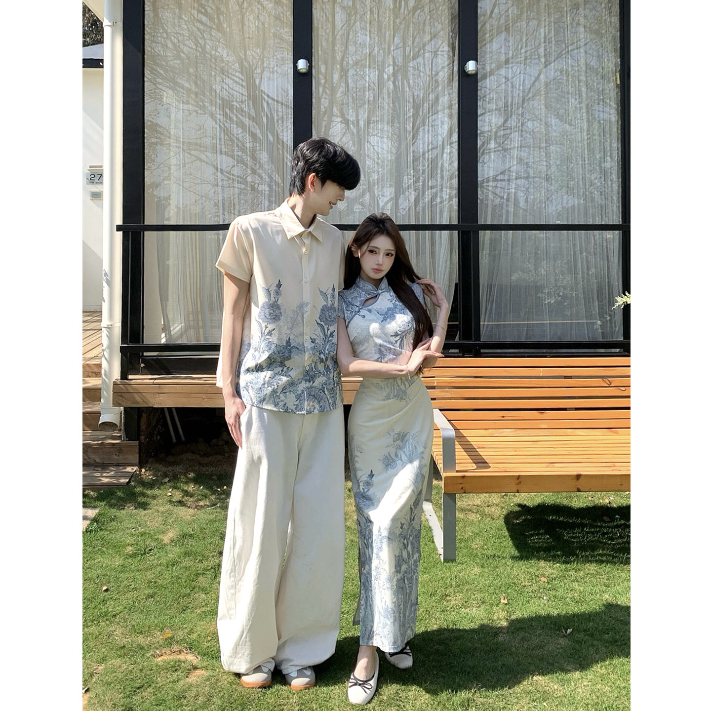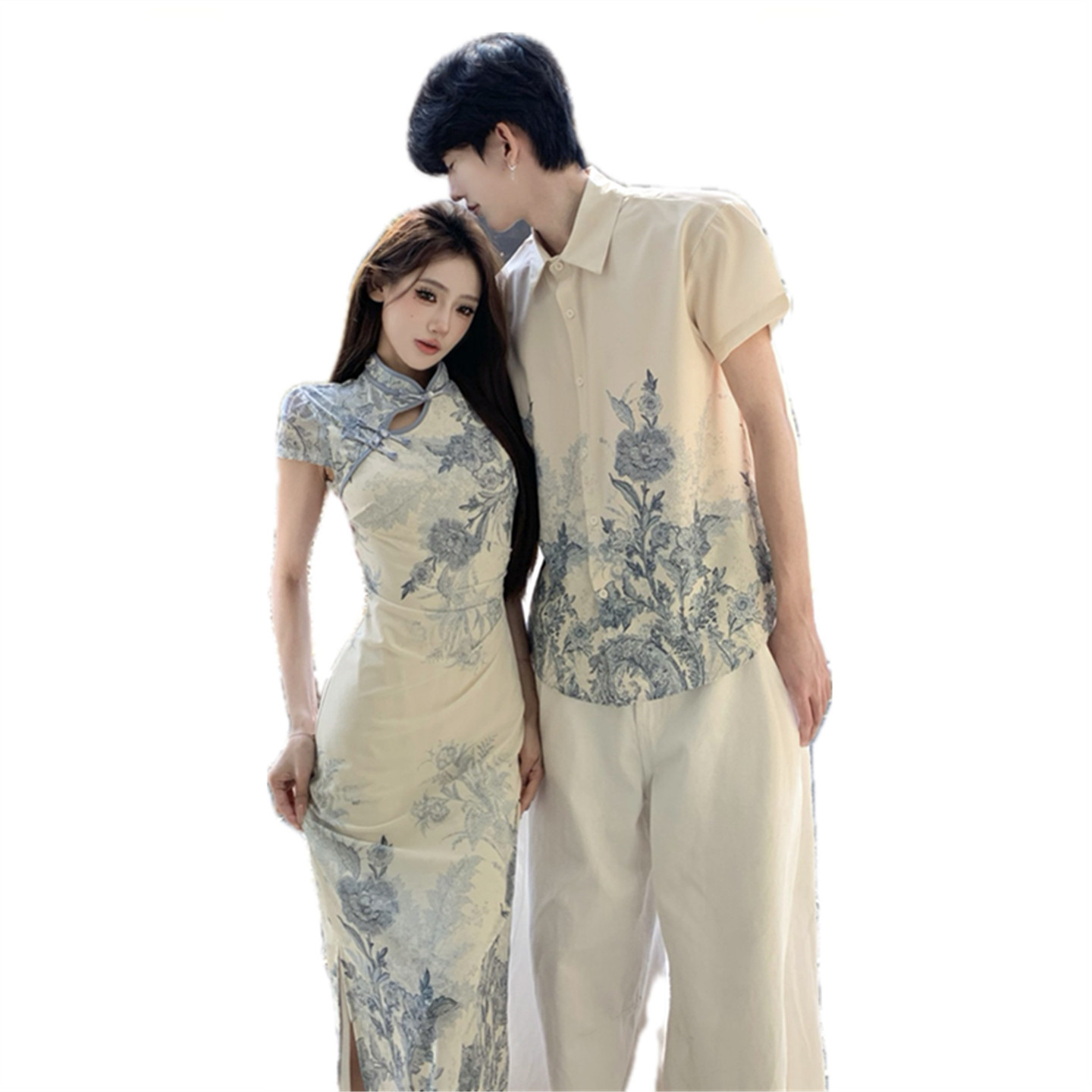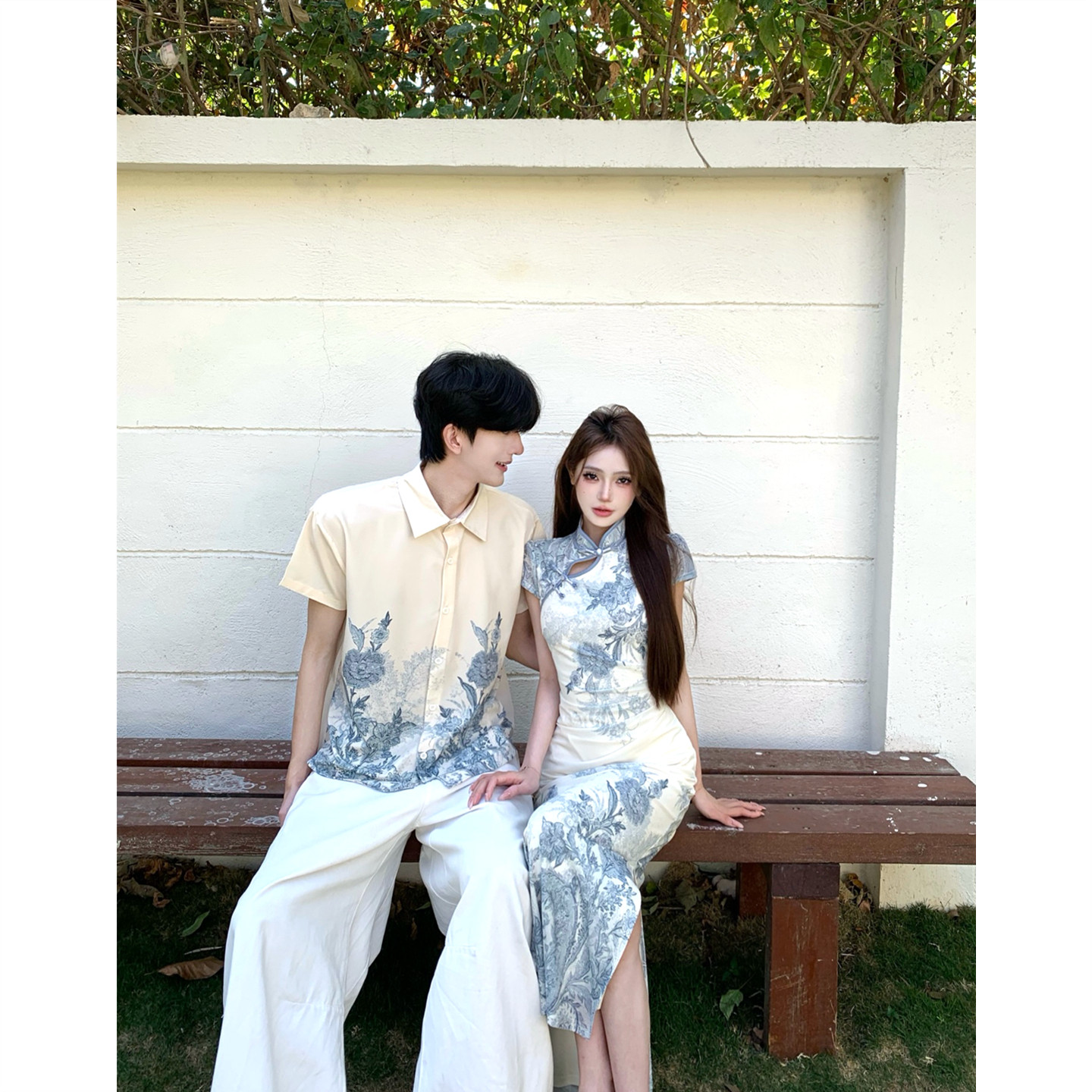 情侣装 女旗袍连衣裙法式 夏季 衬衫 一裙一衣潮 小众设计感短袖 新中式