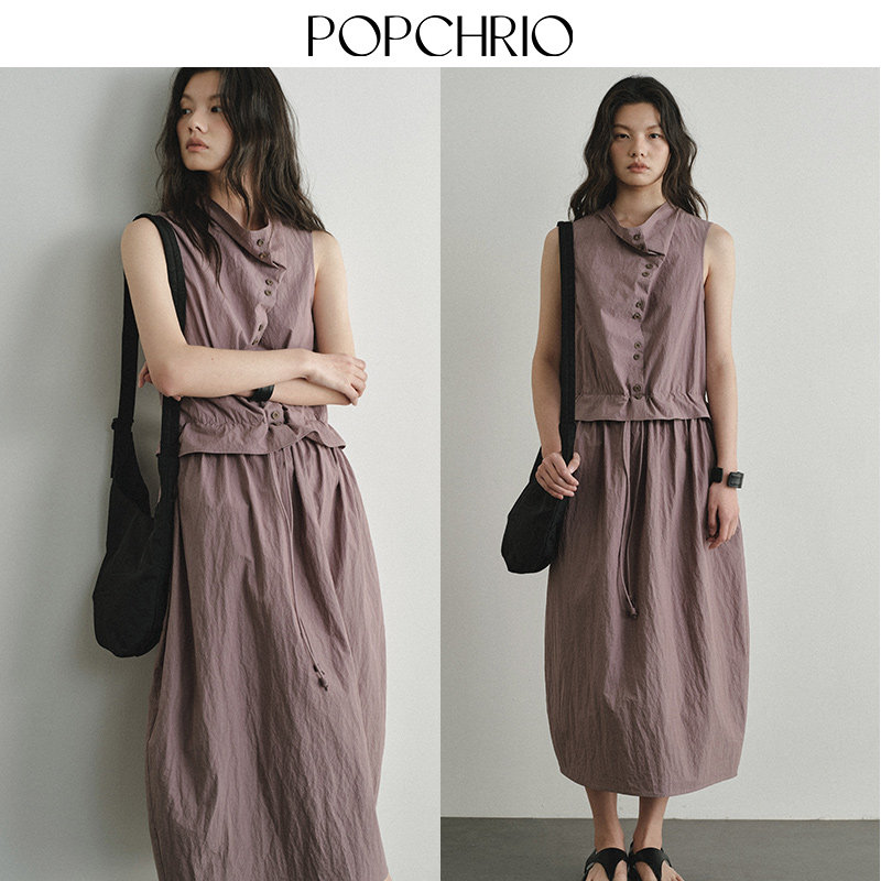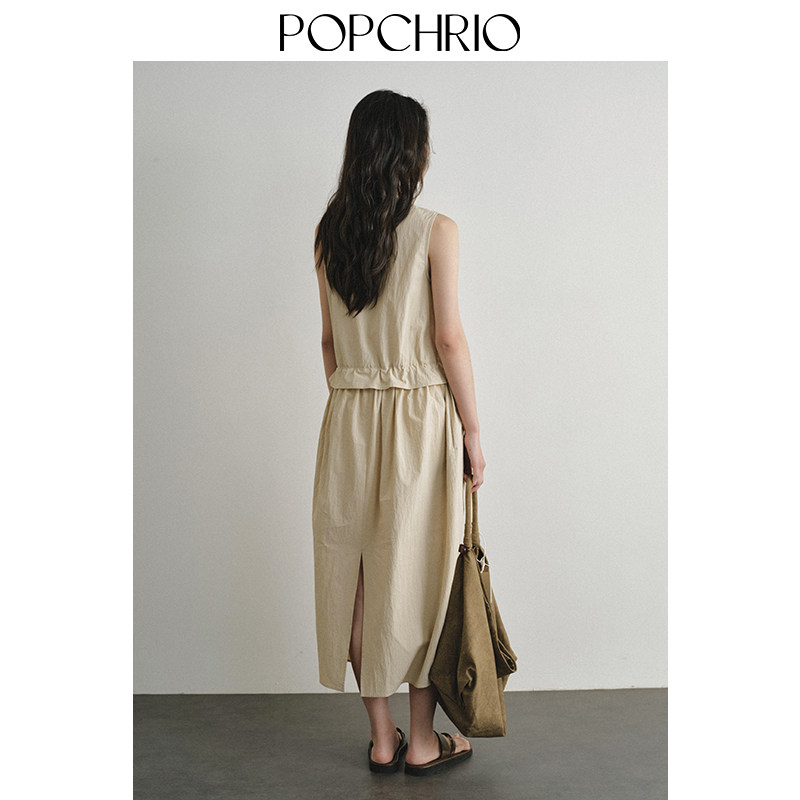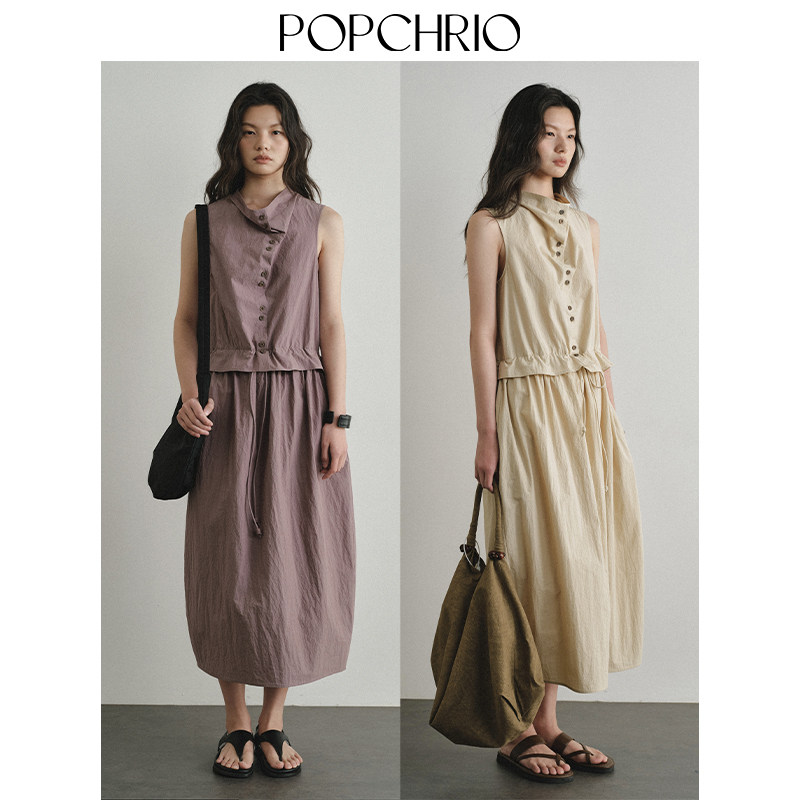 式 日系复古皱感微荡领背心连衣裙衬衫 马甲花苞型长裙春 23新品
