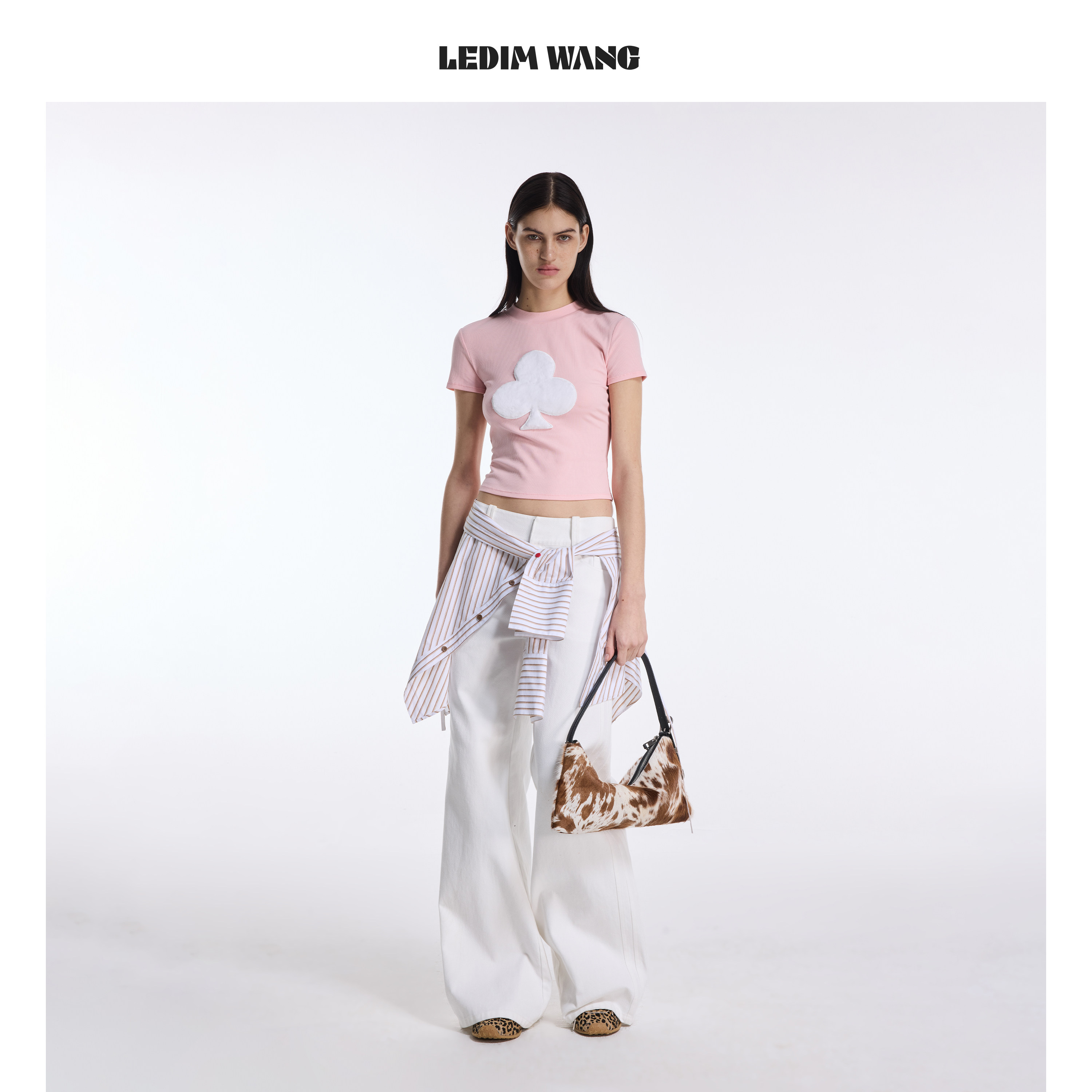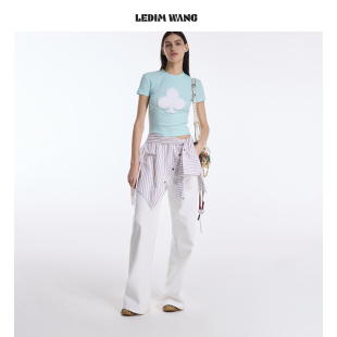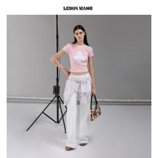 显瘦上衣2026春夏新款 T恤女虾粉色修身 WANG毛绒撞色短袖 LEDIM