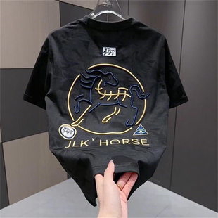 潮牌重工刺绣马图案红色本命年圆领短袖 国潮上衣男 T恤男痞帅时尚