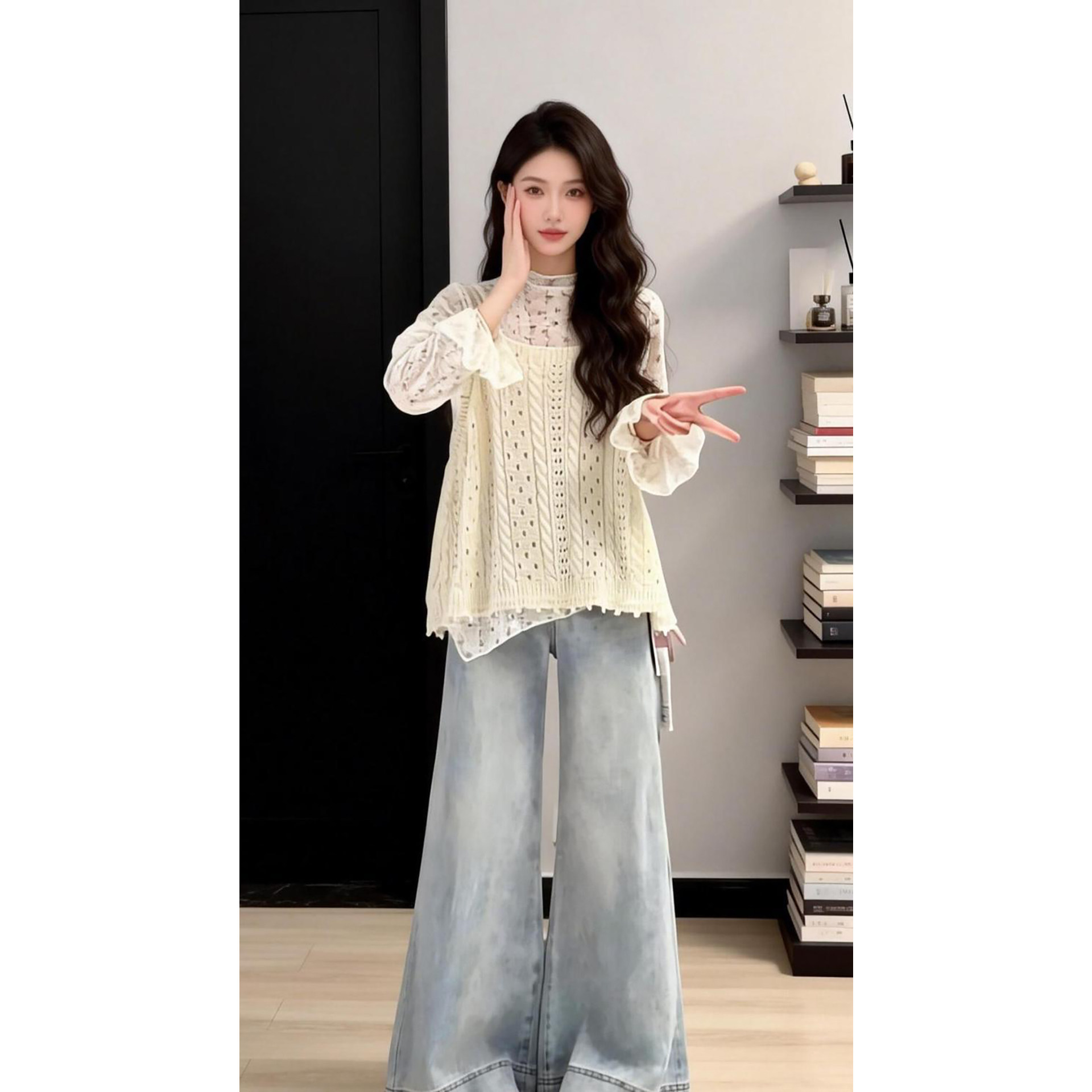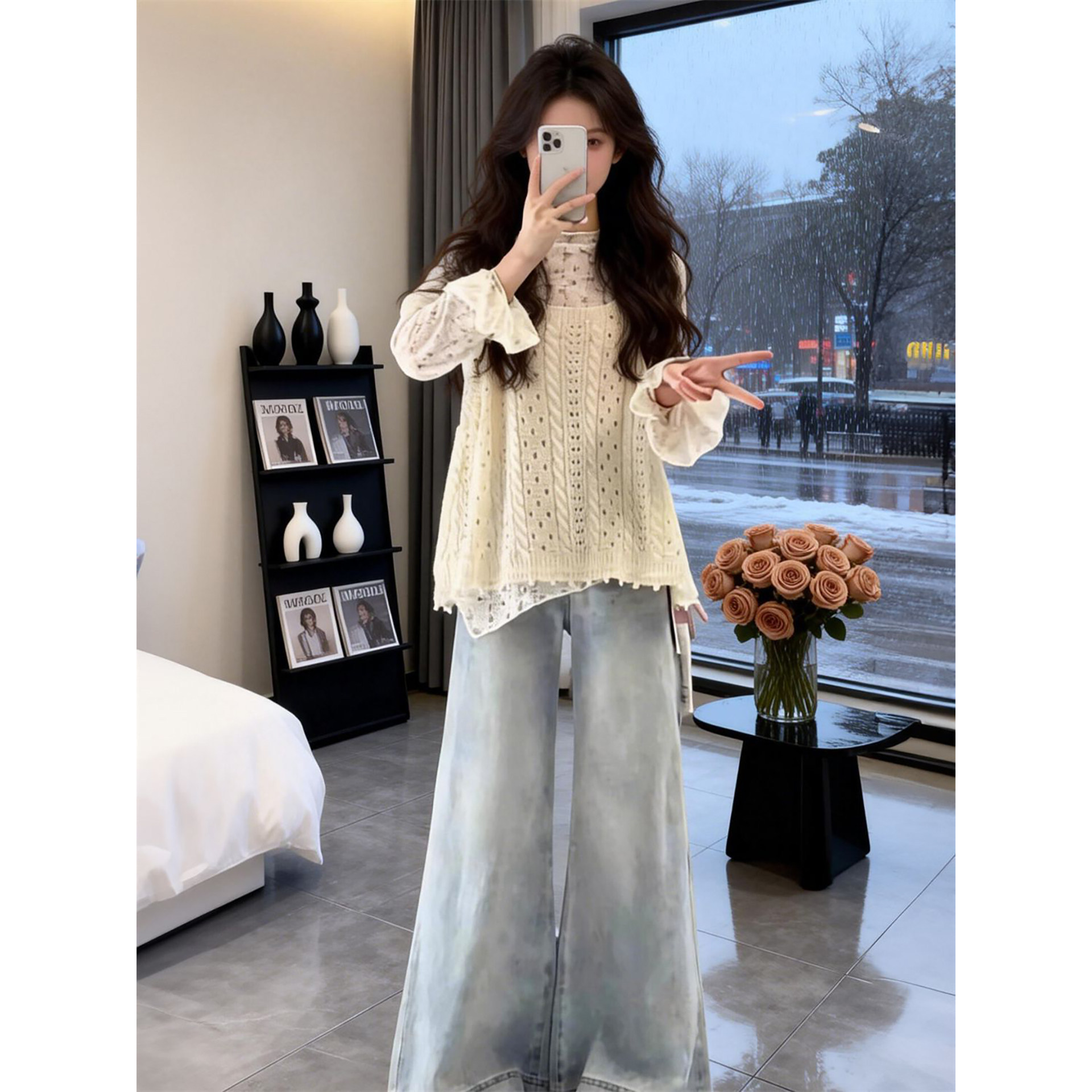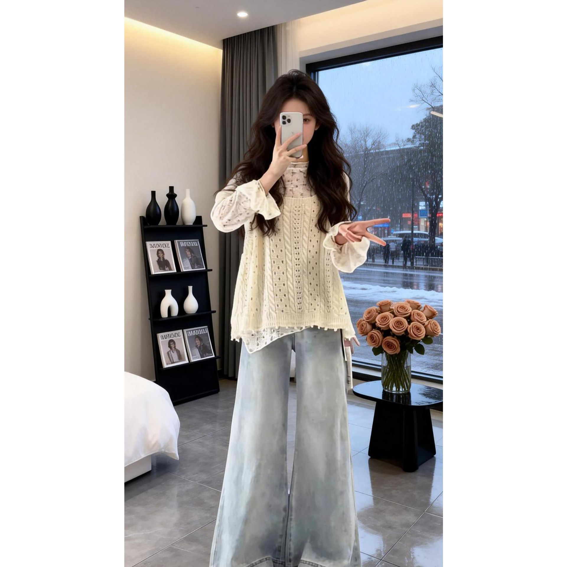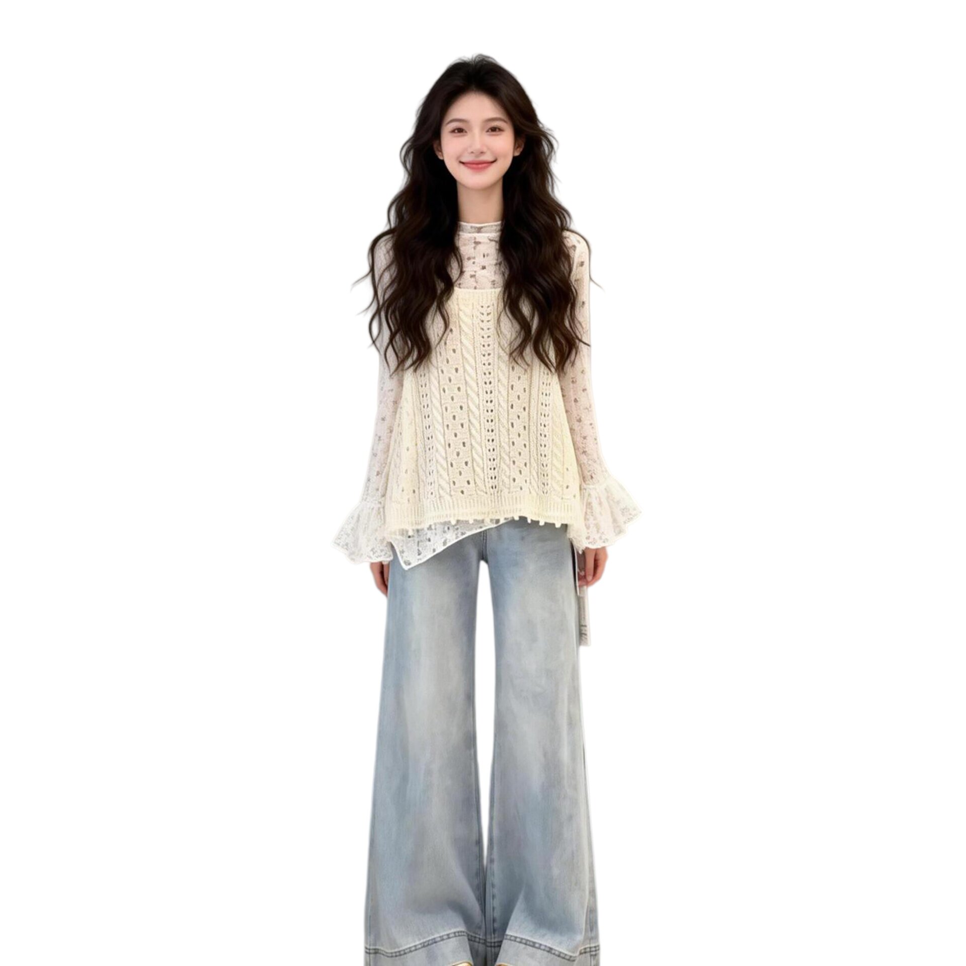 两件套装 搭配碎花打底上衣衫 温柔气质风宽松镂空背心针织罩衫 时尚