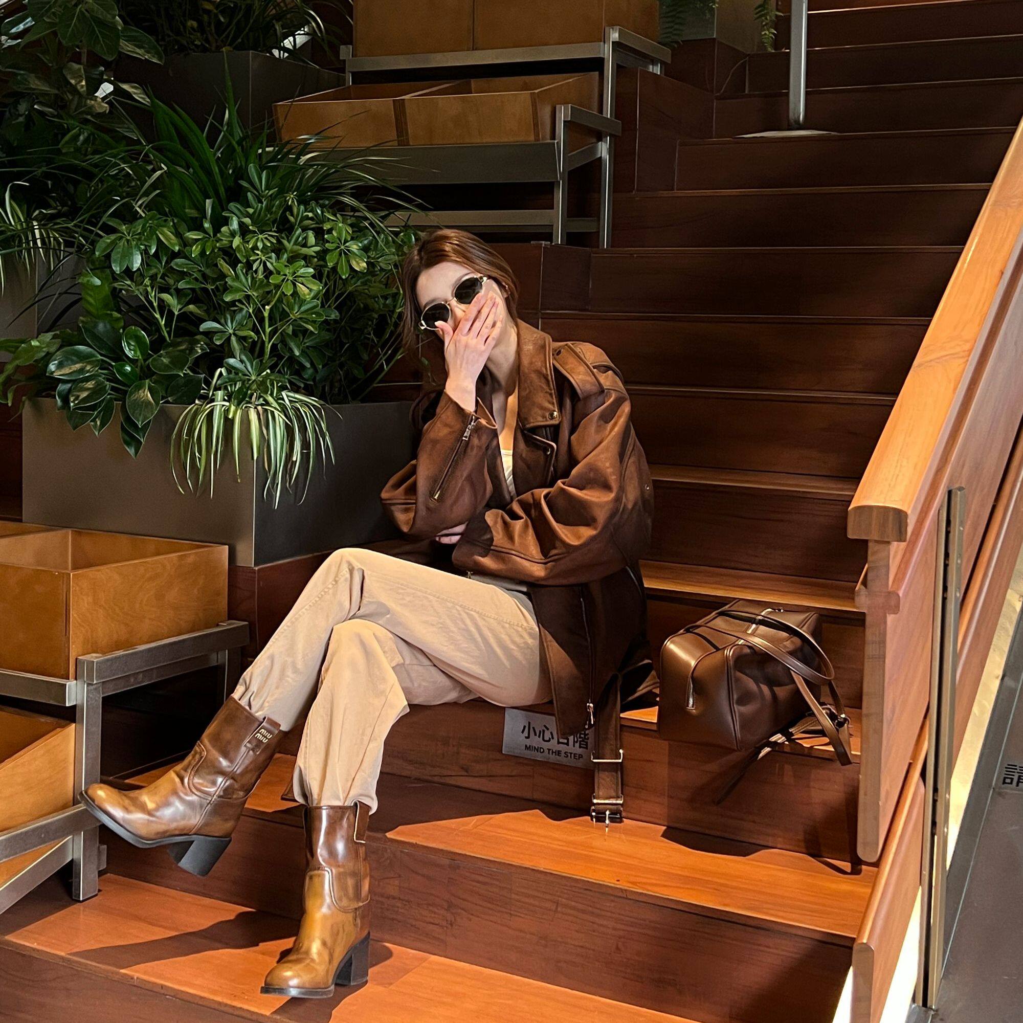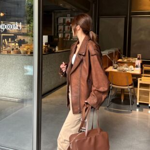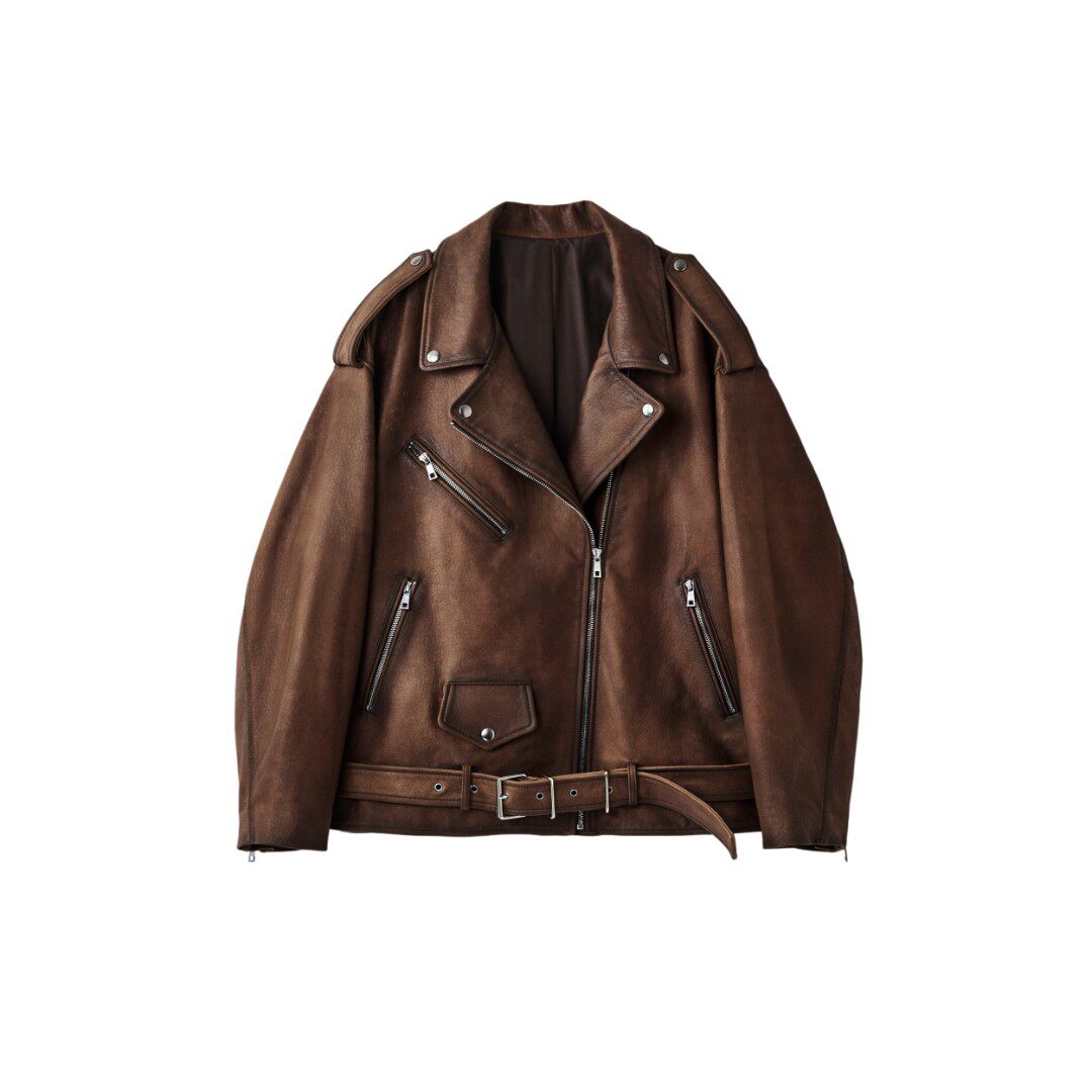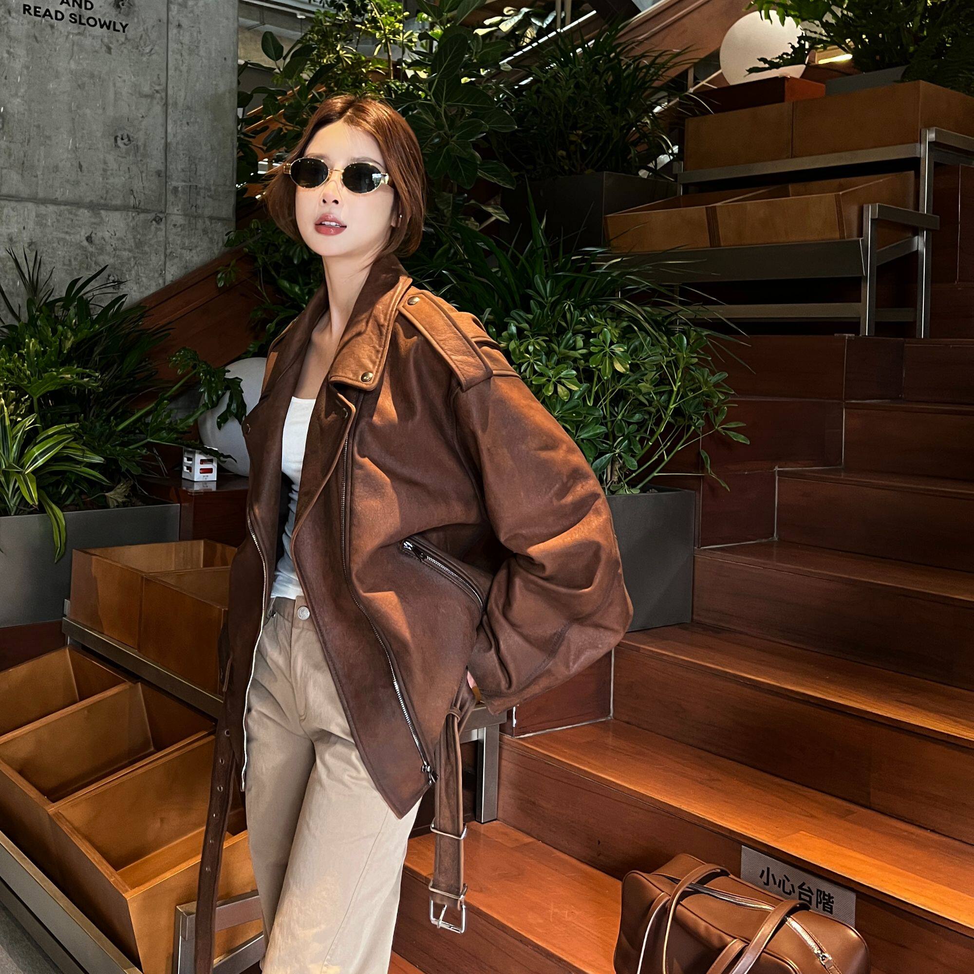 高奢头层绵羊皮绒面复古擦色做旧酷飒机车风真皮外套 弓ECHO