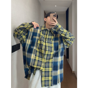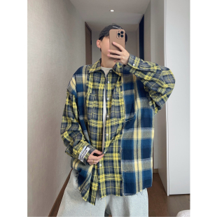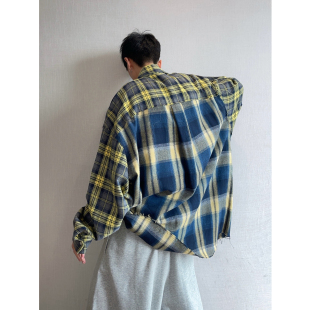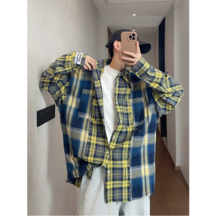 男INS 衬衫 dannyandzee春季 复古痞帅宽松黄蓝格子拼接毛边宽松长袖