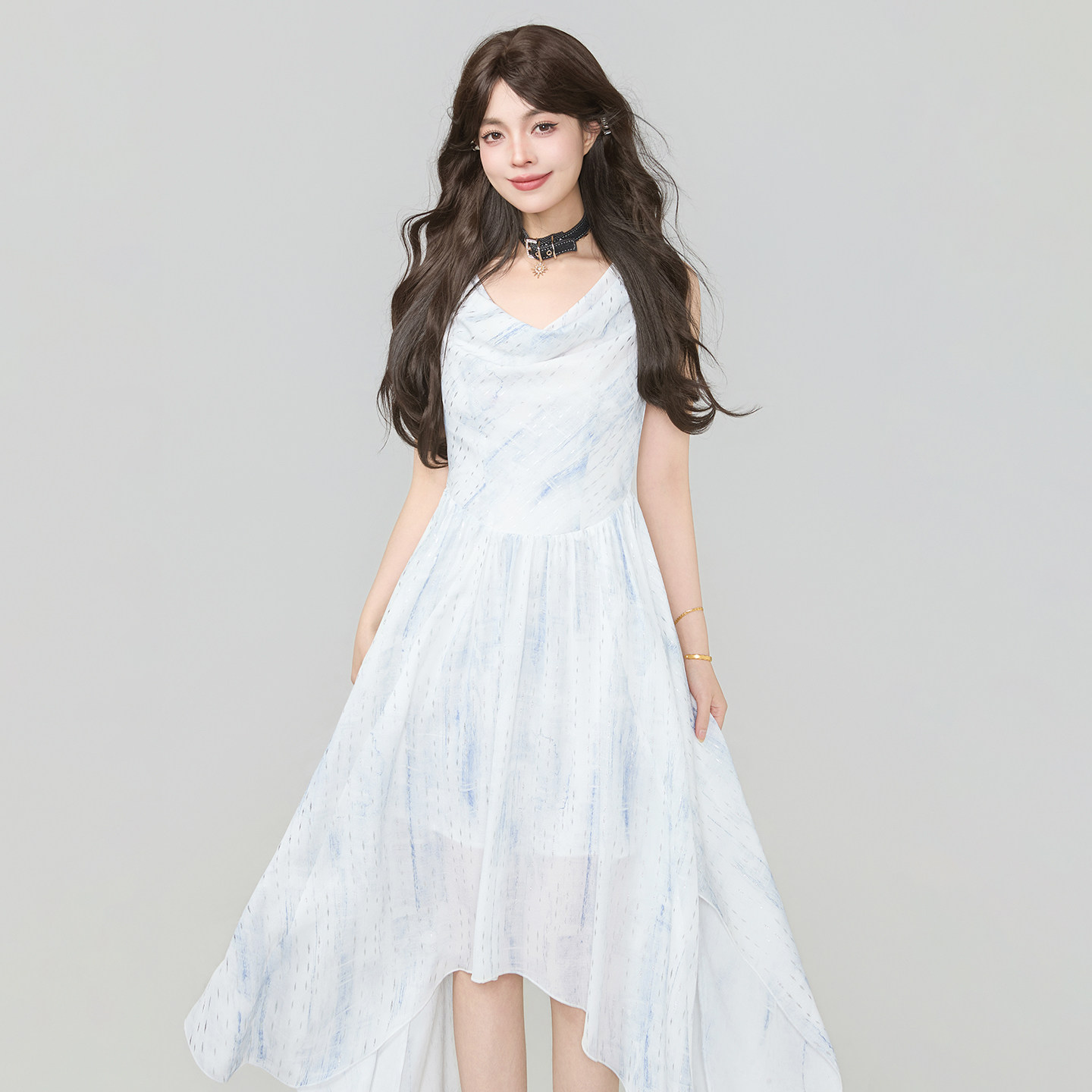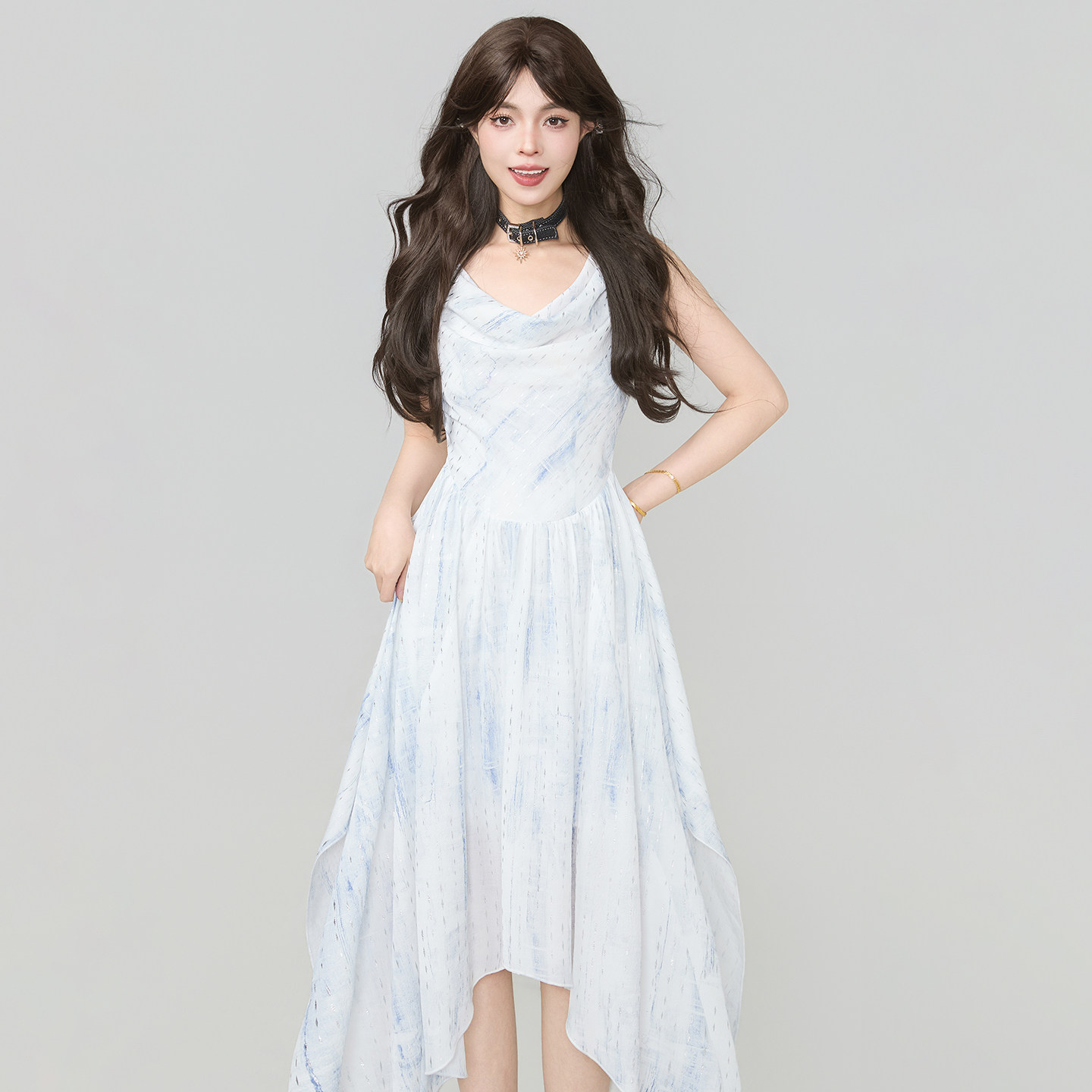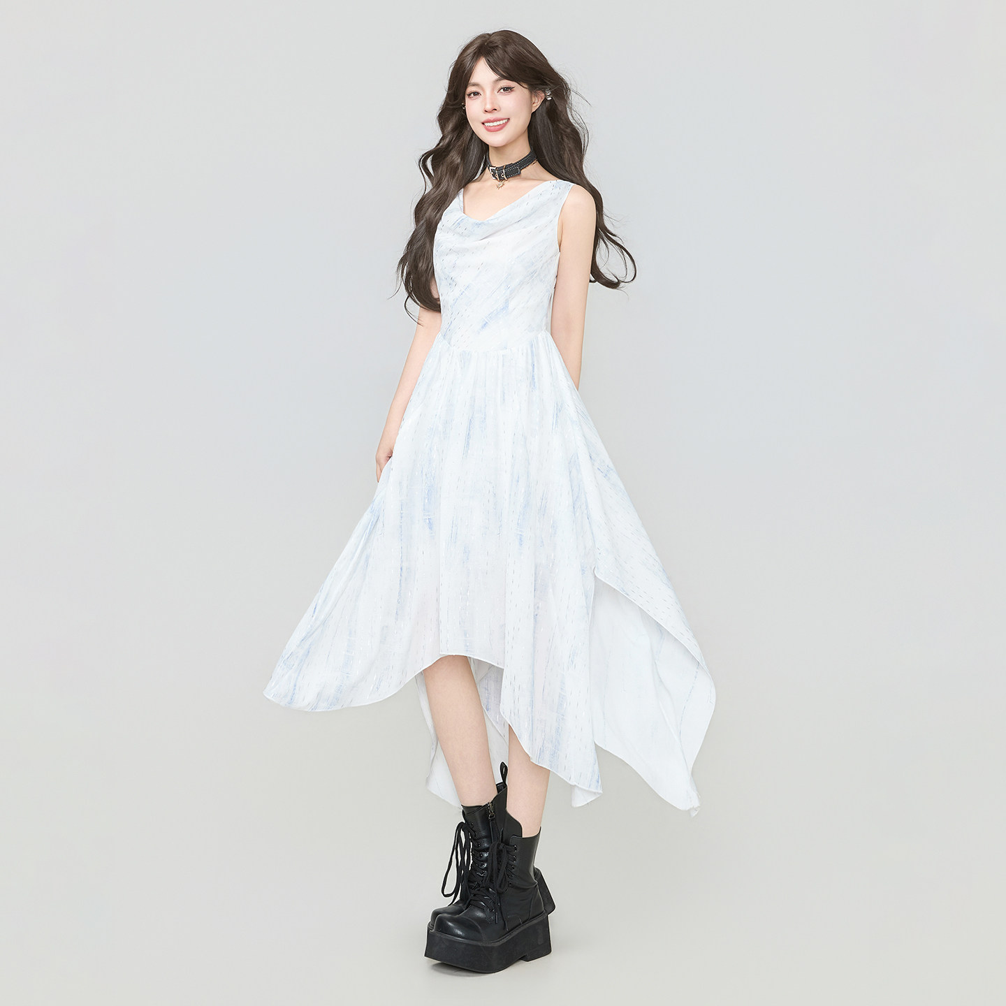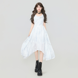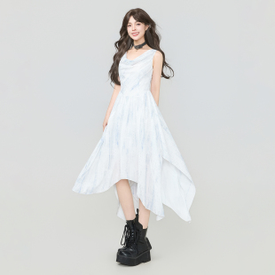 KEIKO清冷感蓝色荡领无袖 气质仙气不规则A字大摆长裙 连衣裙26夏季