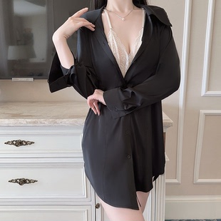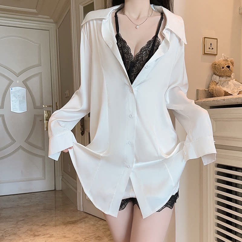 套装 性感冰丝白衬衫 短裤 蕾丝长袖 男友风家居服可外穿 睡衣女夏薄款