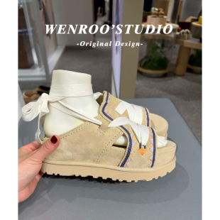 增高凉拖鞋 女夏季 外穿 波西米亚风刺绣绑带厚底罗马凉鞋 宋雨琦同款