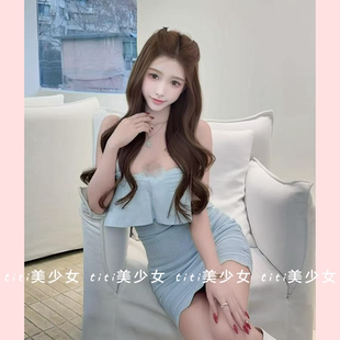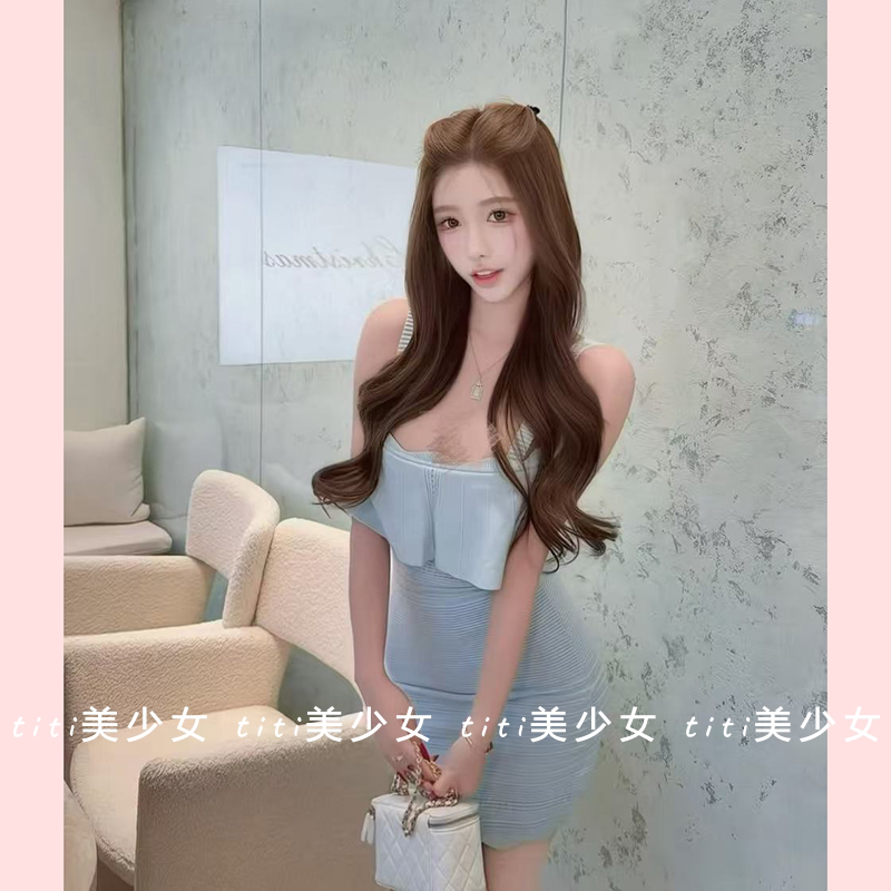 性感吊带包臀裙 定染玻璃蓝荷叶边弹力针织收腰修身 TiTi美少女