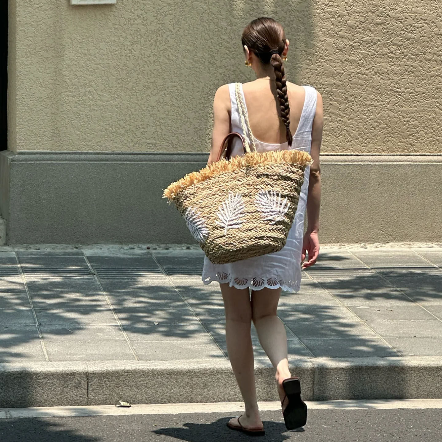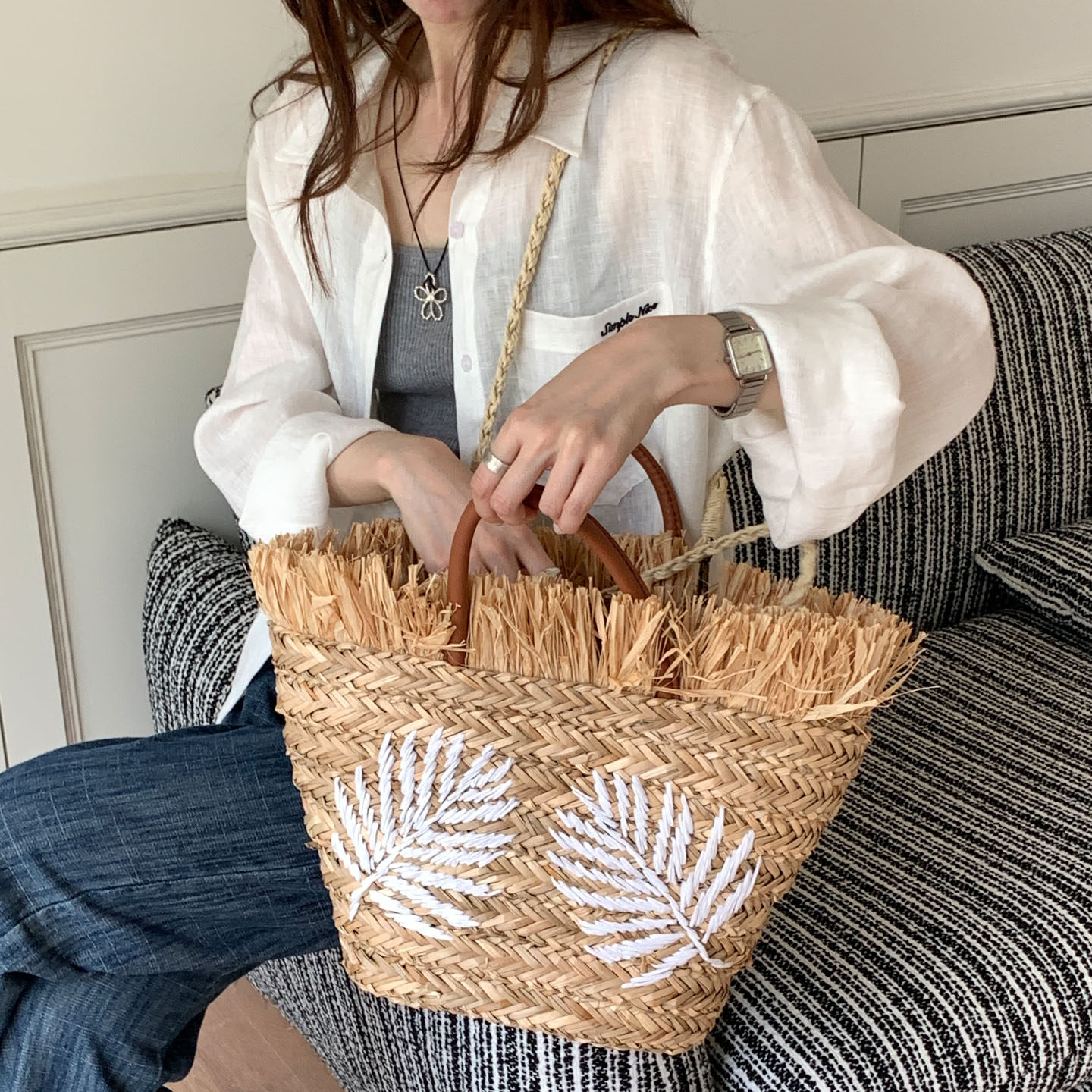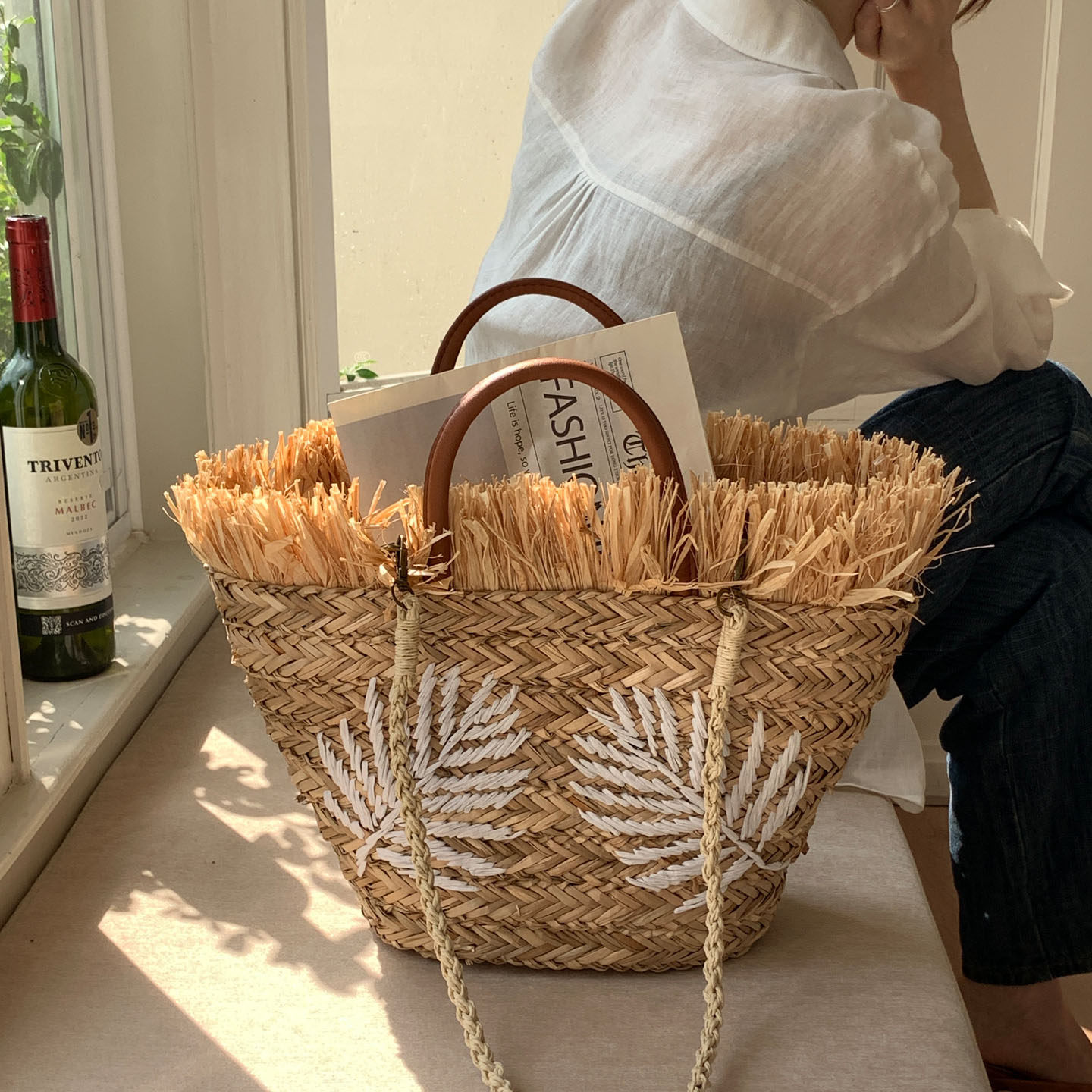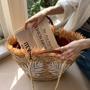 里洛家 叶子刺绣草编包大容量海岛度假风单肩包流苏编织包托特包