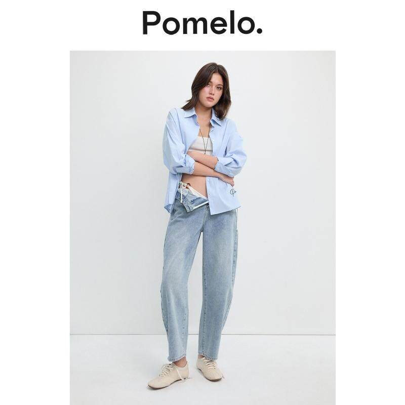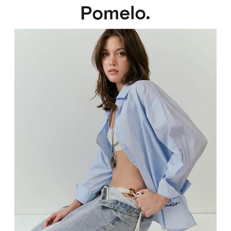 logo宽松显瘦男友风衬衫 刺绣 慵懒风浅蓝细条纹衬衫 Pomelo