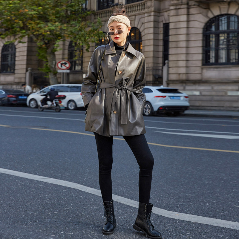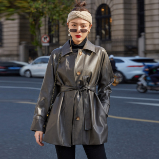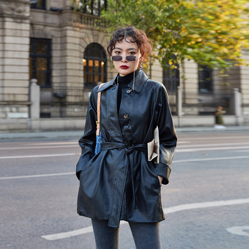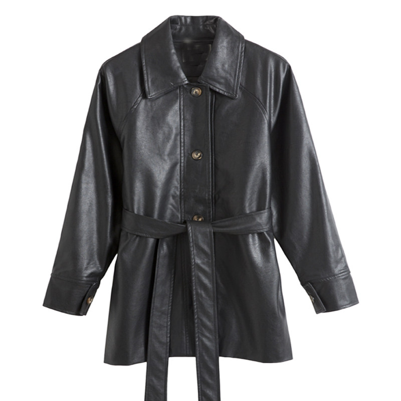 机车韩版 宽松系带中长款 收腰休闲 时尚 皮衣外套女2025春秋pu皮新款