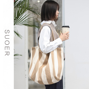托特包女2020新款 chic休闲百搭帆布包女撞色条纹单肩包大容量 韩版