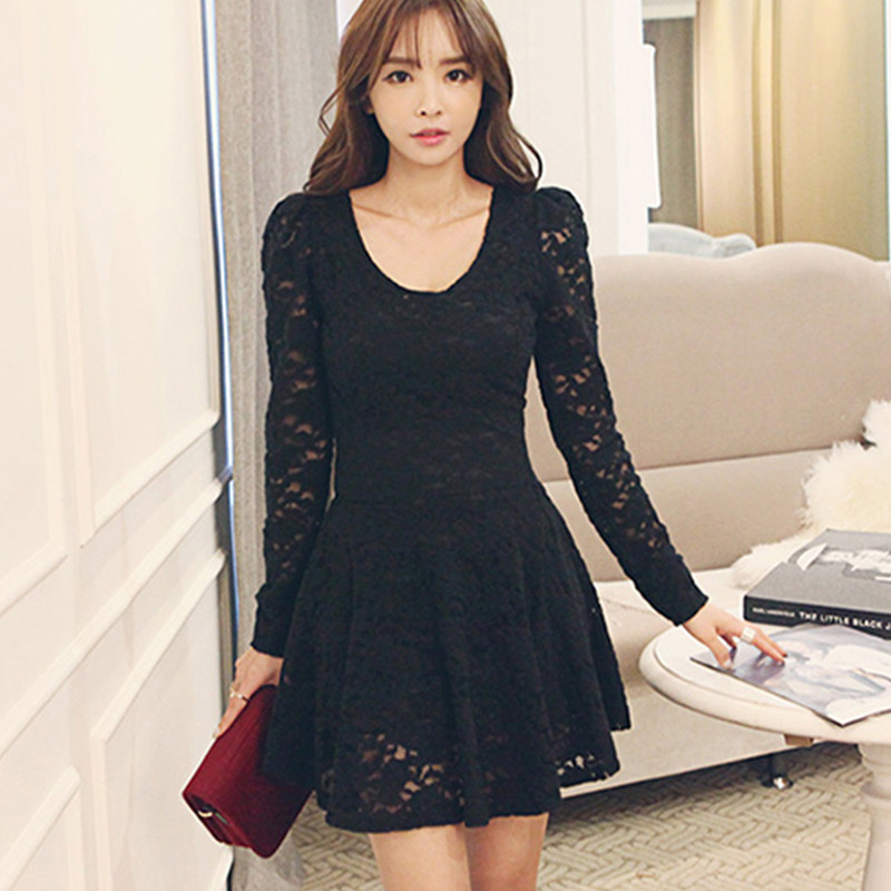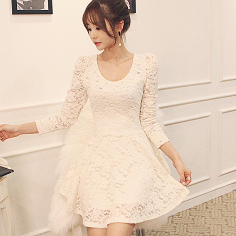 韩版 泡泡袖 大领口A字裙遮肉显瘦轻熟风裙子 大码 蕾丝连衣裙秋新品