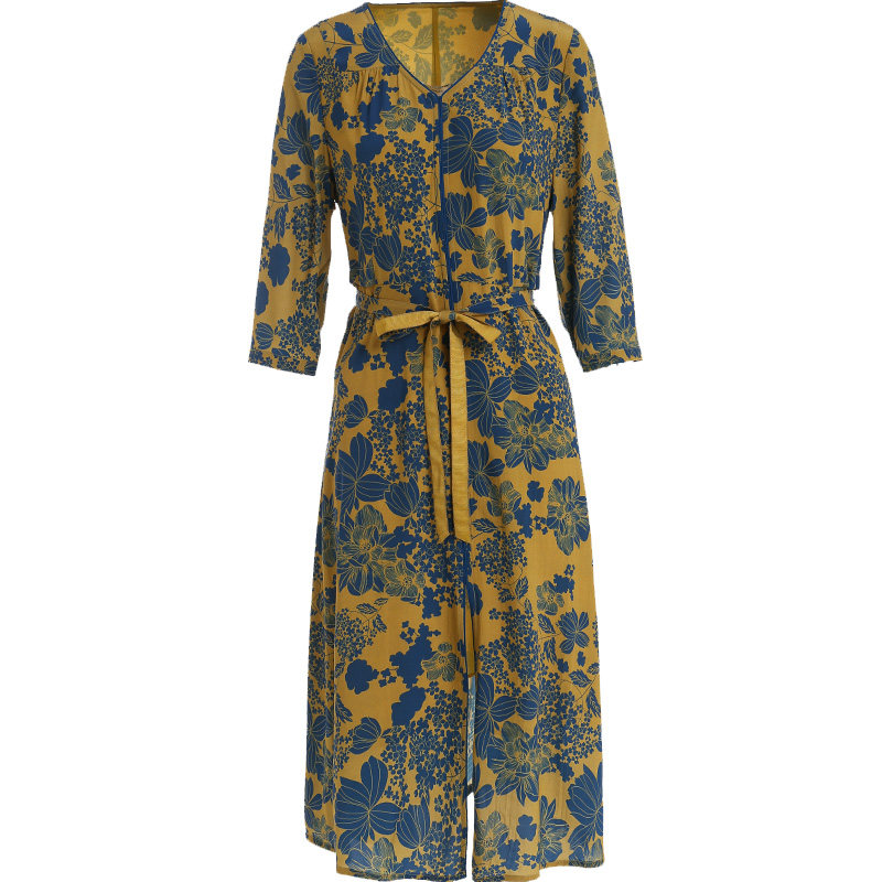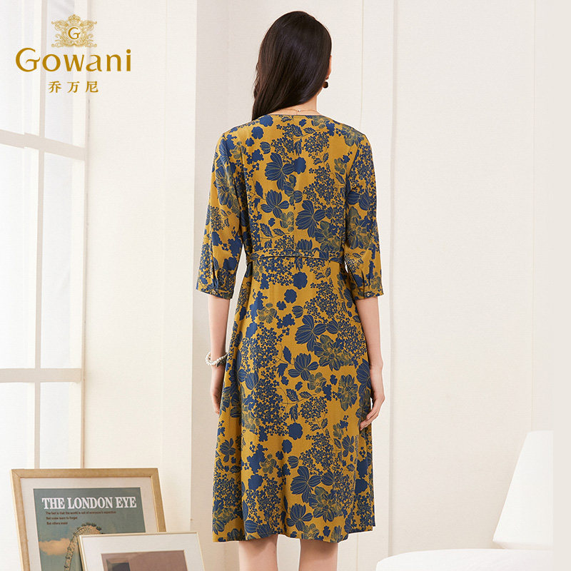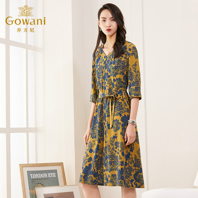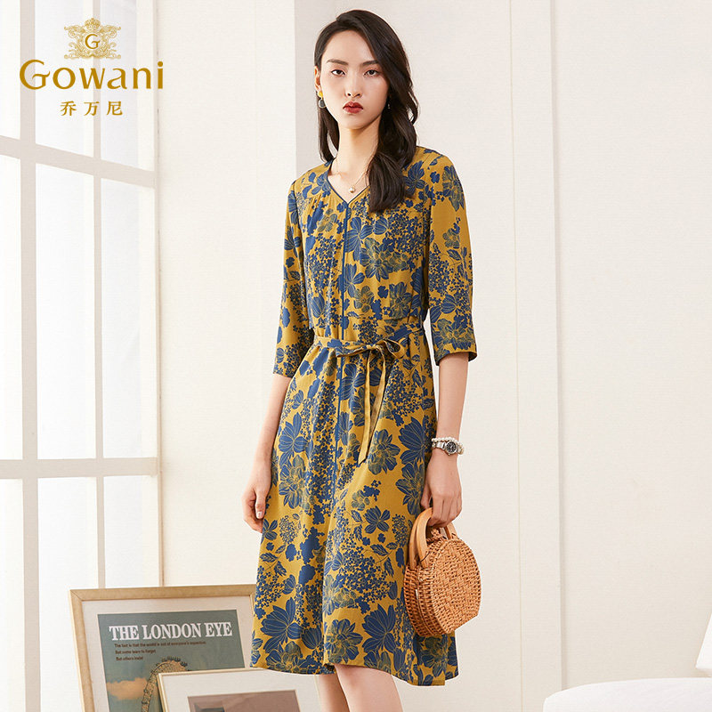 气质高腰碎花V领真丝连衣裙桑蚕丝女中长款 乔万尼商场新款 春修身