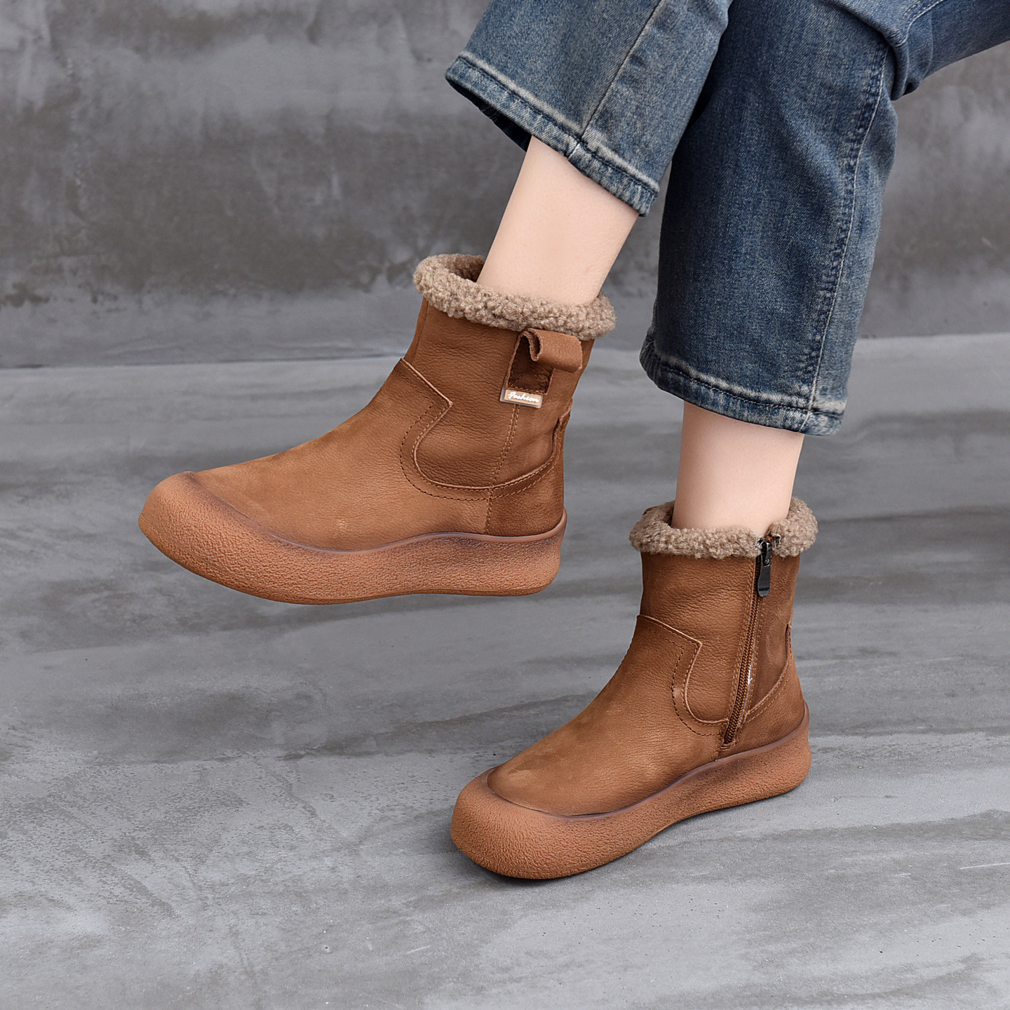 厚底高帮鞋 新款 轻便软底侧拉链短靴 雪地靴女2025冬季 真皮加绒棉鞋