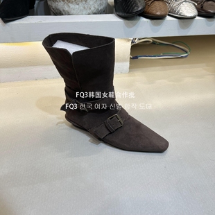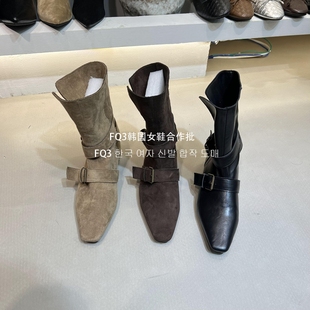 FQ3实拍 Luomanli美拉德绒面粗跟中筒靴女韩系复古皮带扣瘦瘦靴潮
