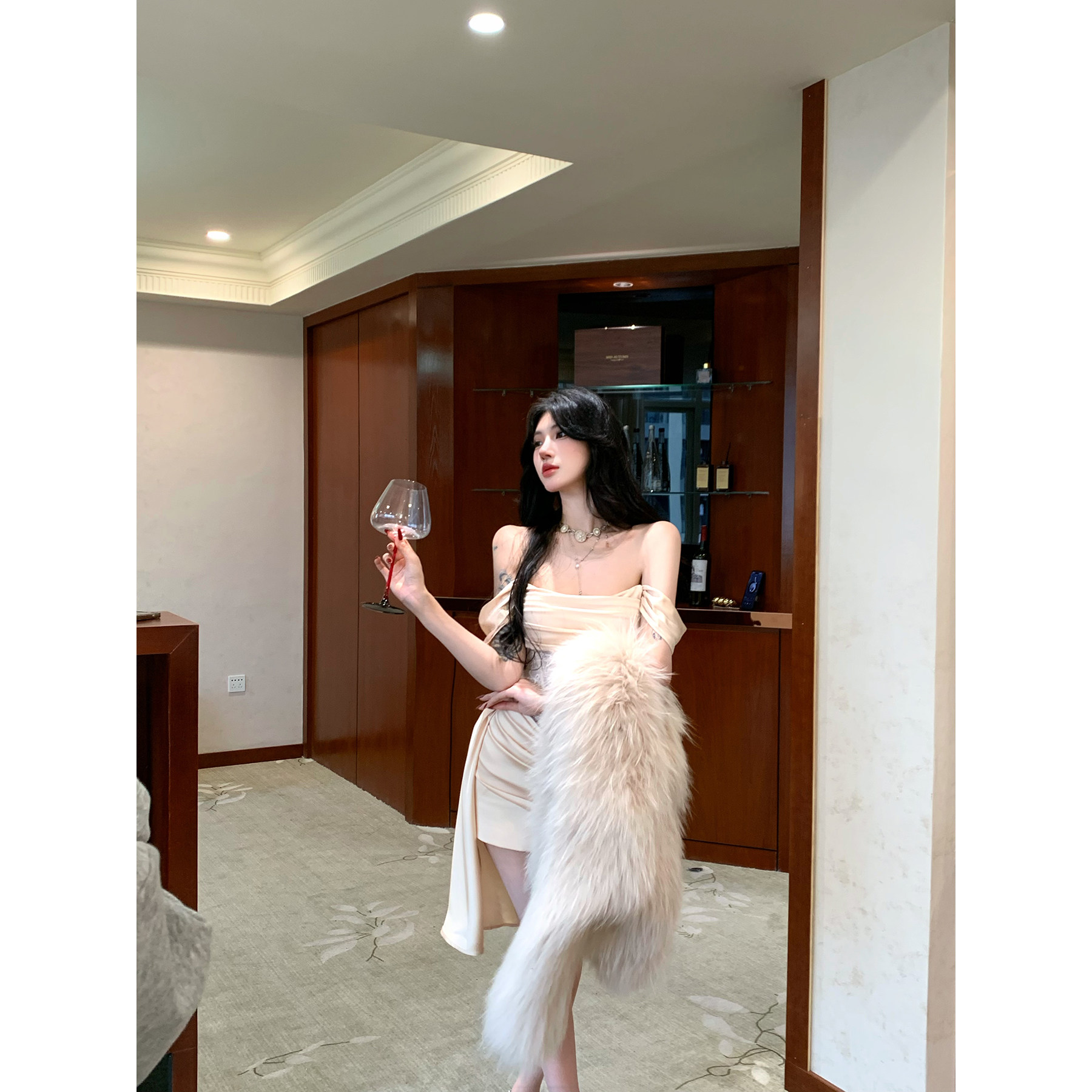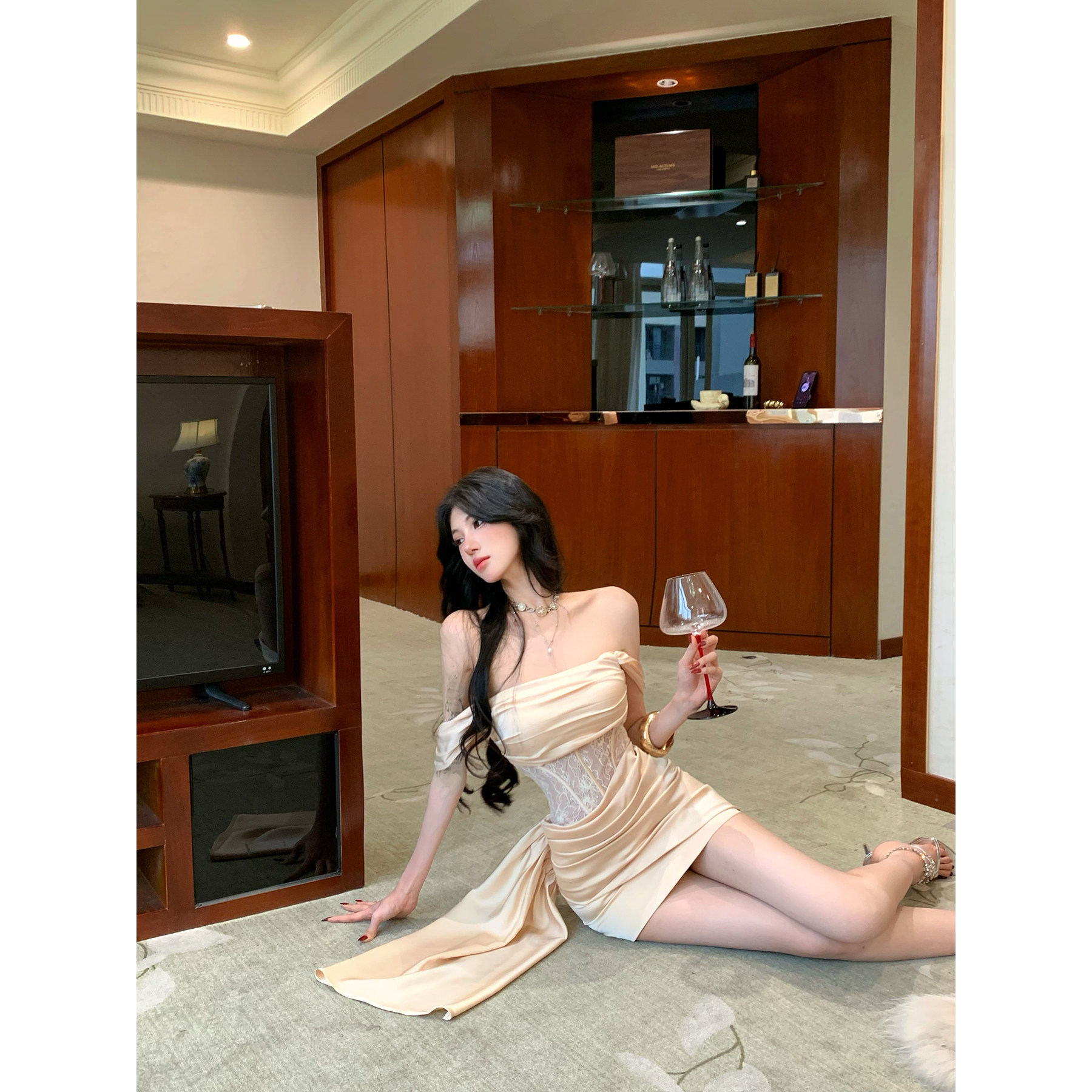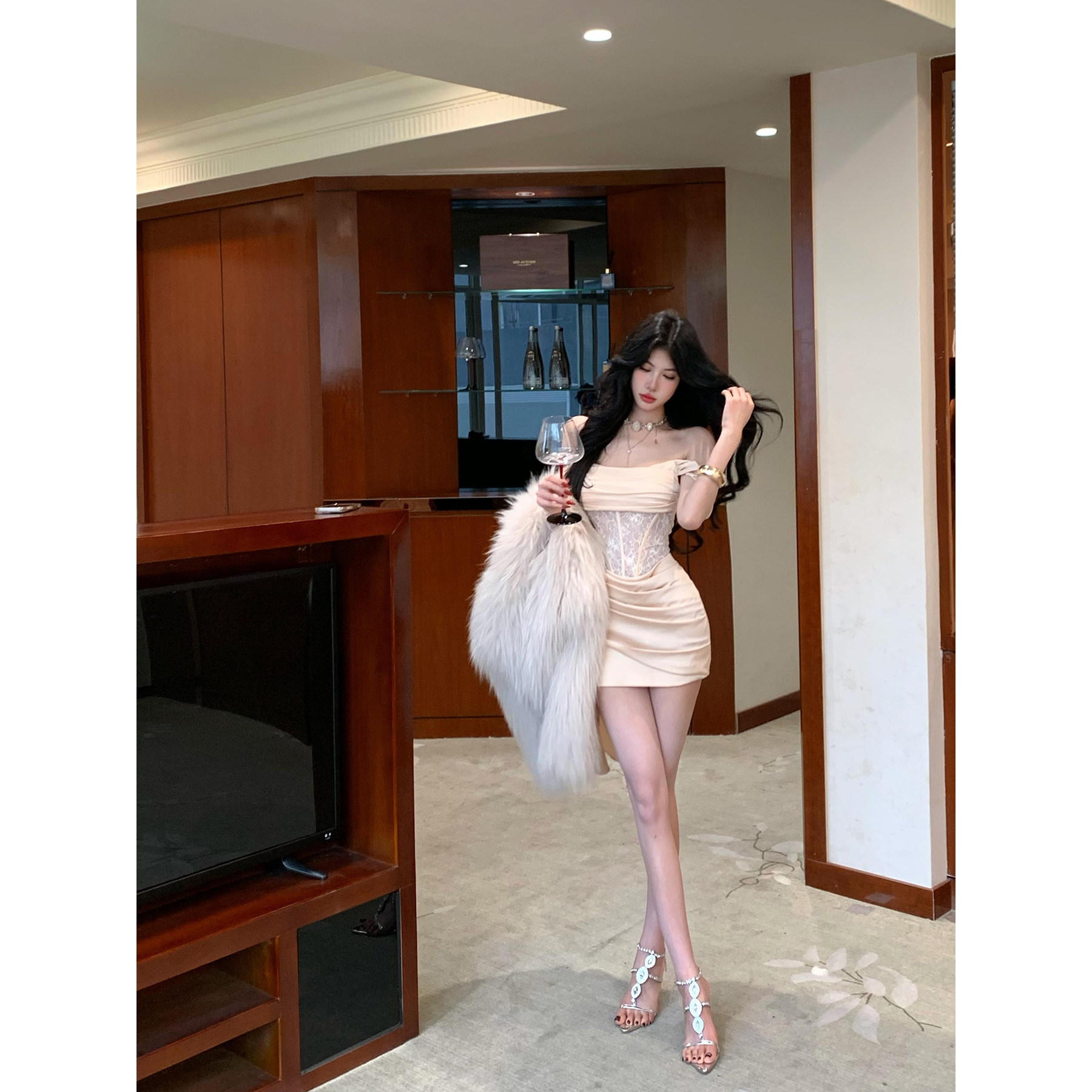 牛了牛了 蕾丝拼接包臀裙生日裙子 一字肩抹胸连衣裙女2025冬季