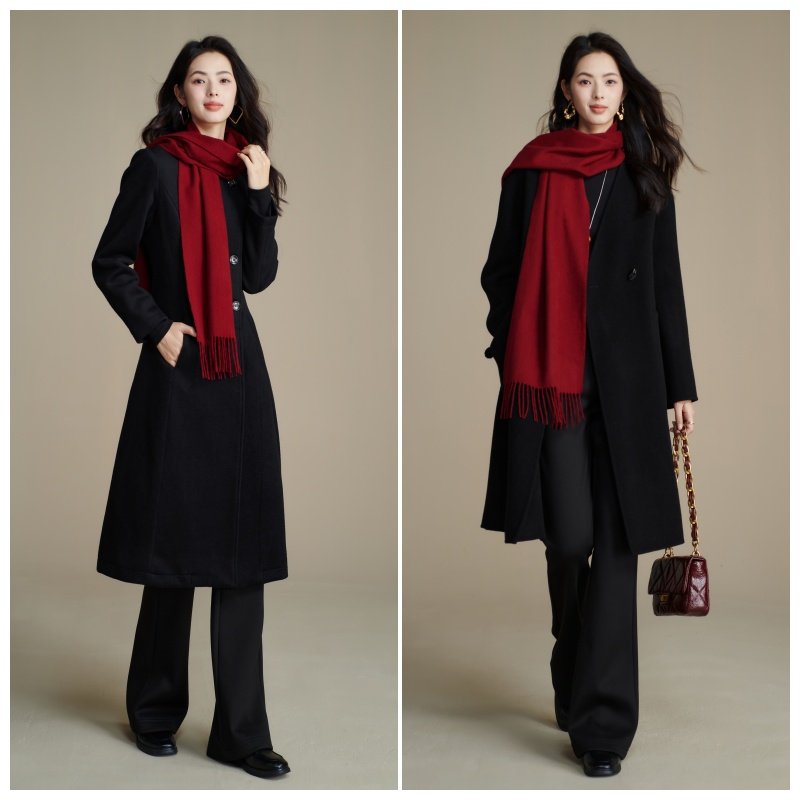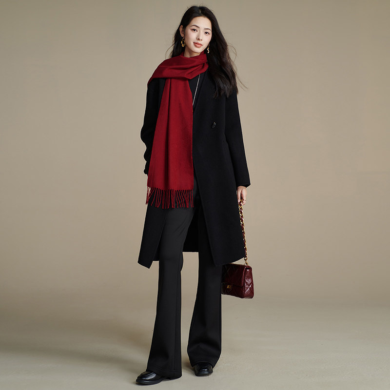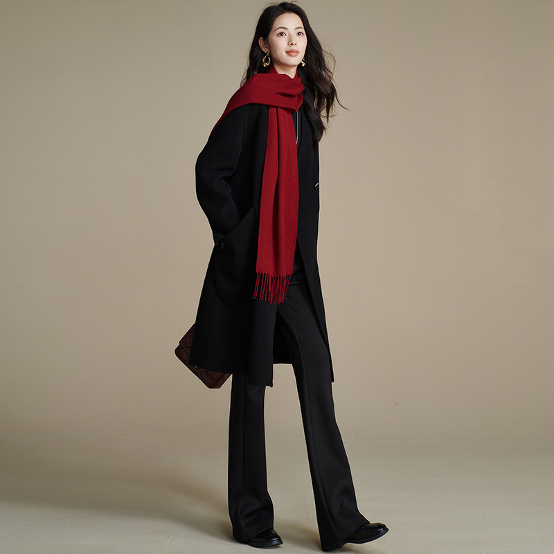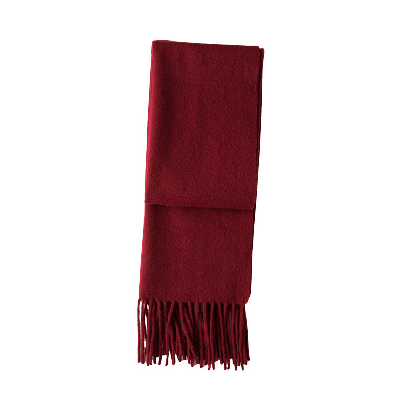 晚白2025年秋冬新款 10山羊绒 波尔多红含流苏围巾 90绵羊毛