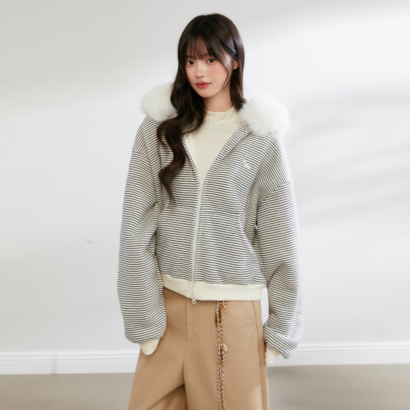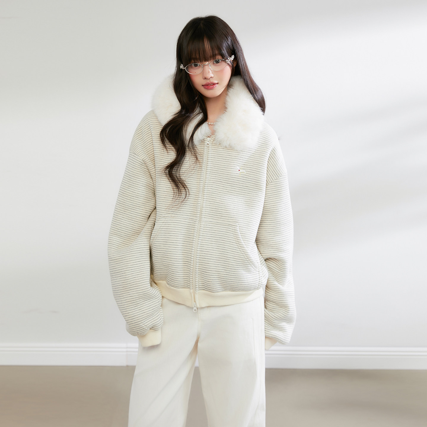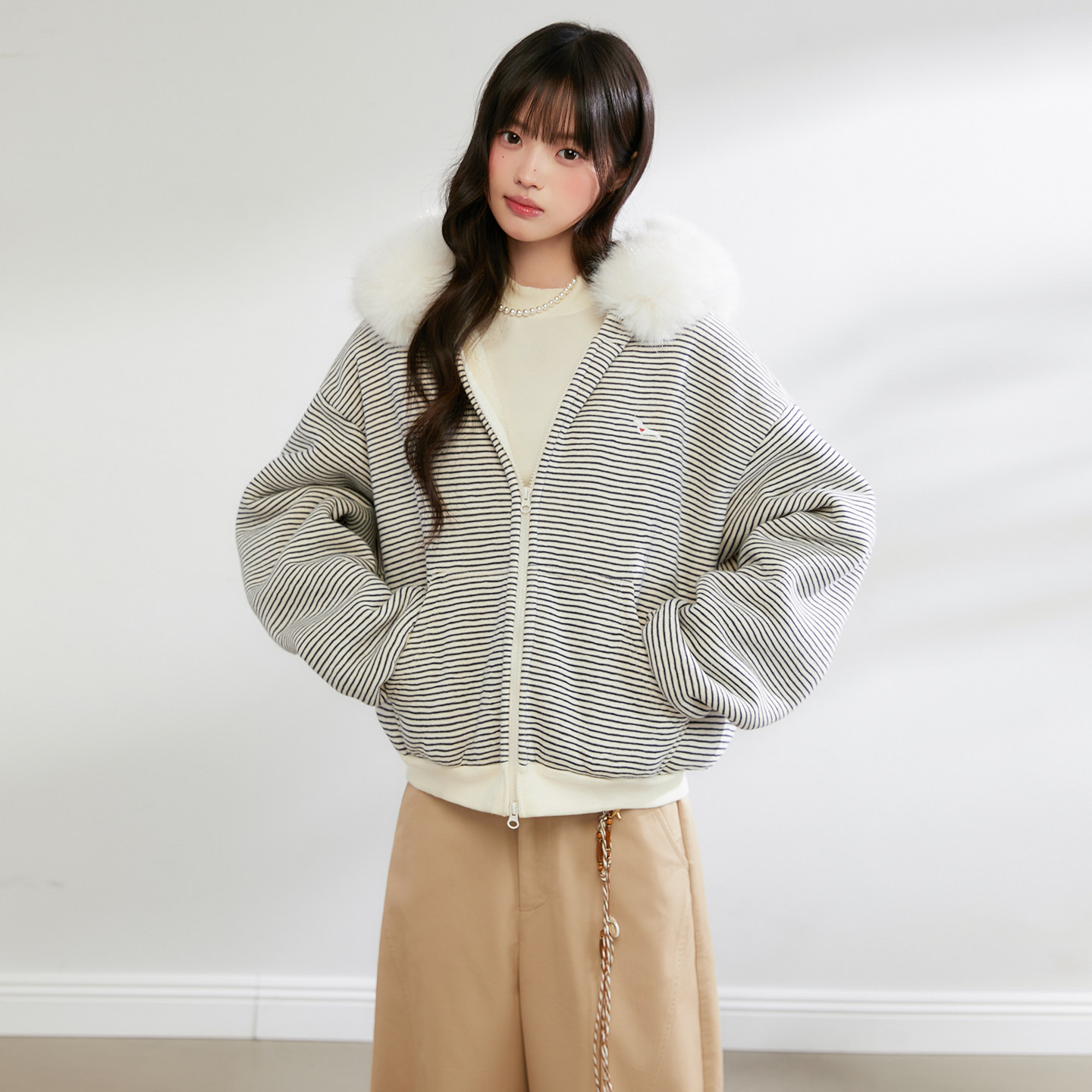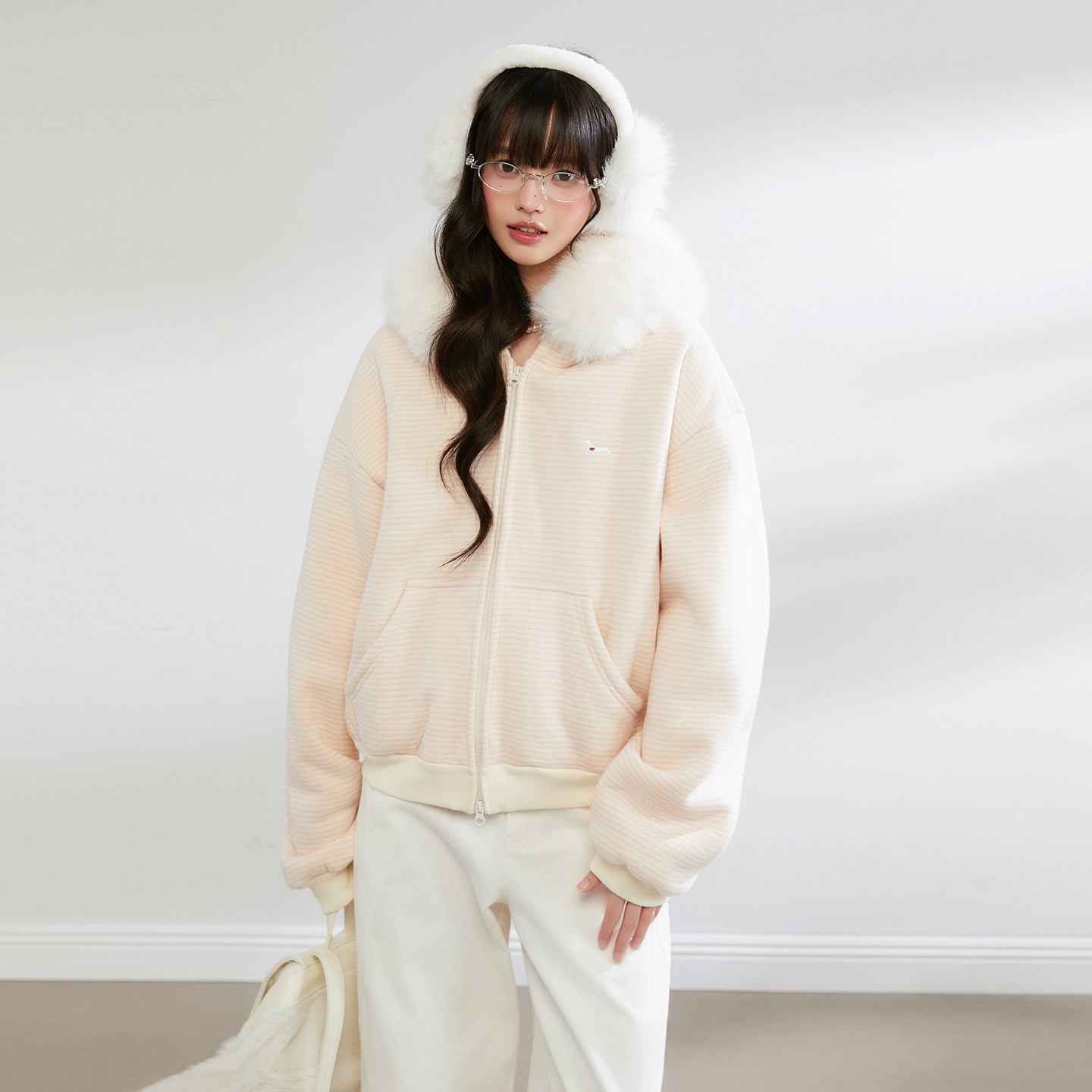 King 上衣 Prince休闲慵懒风毛领连帽卫衣女宽松保暖拉链开衫