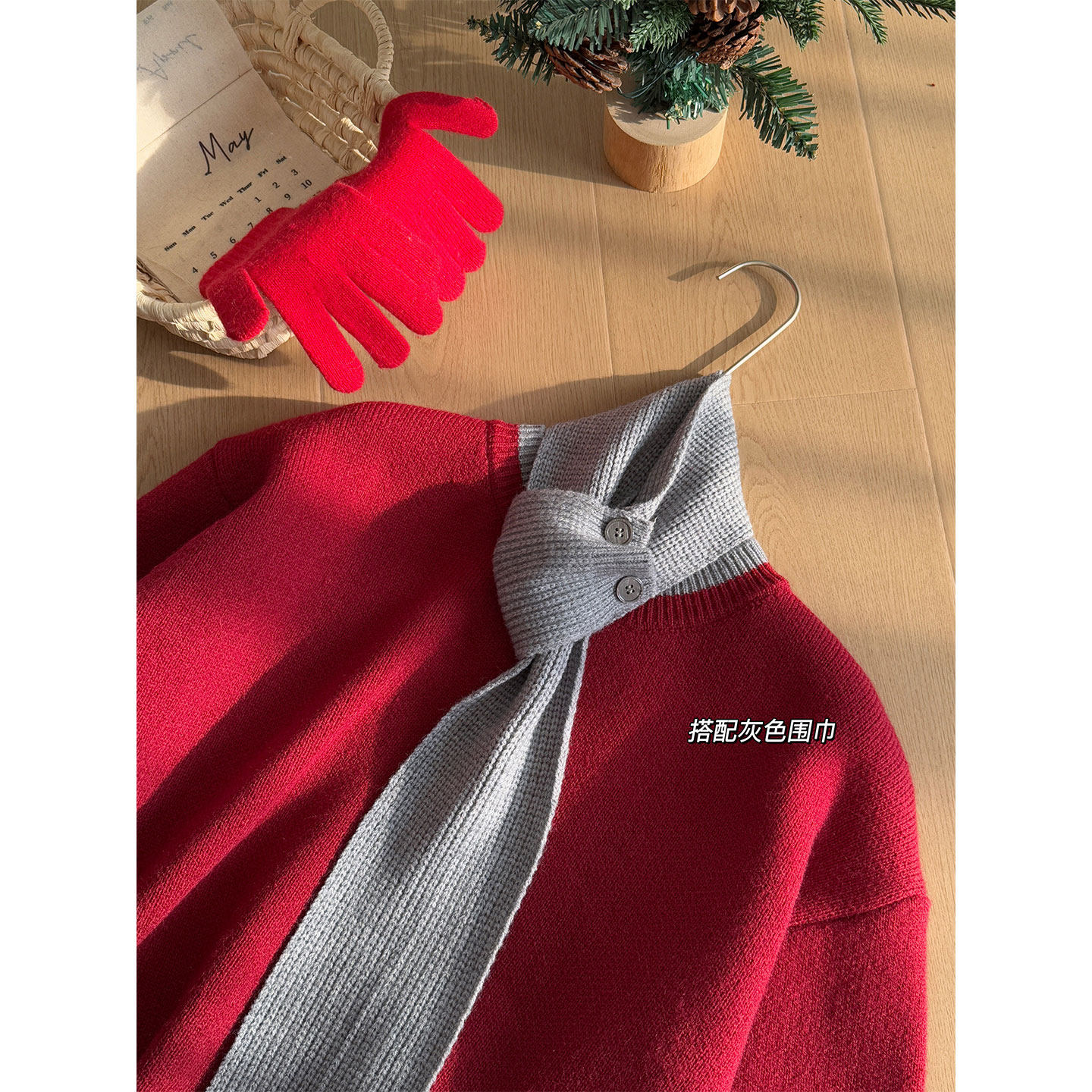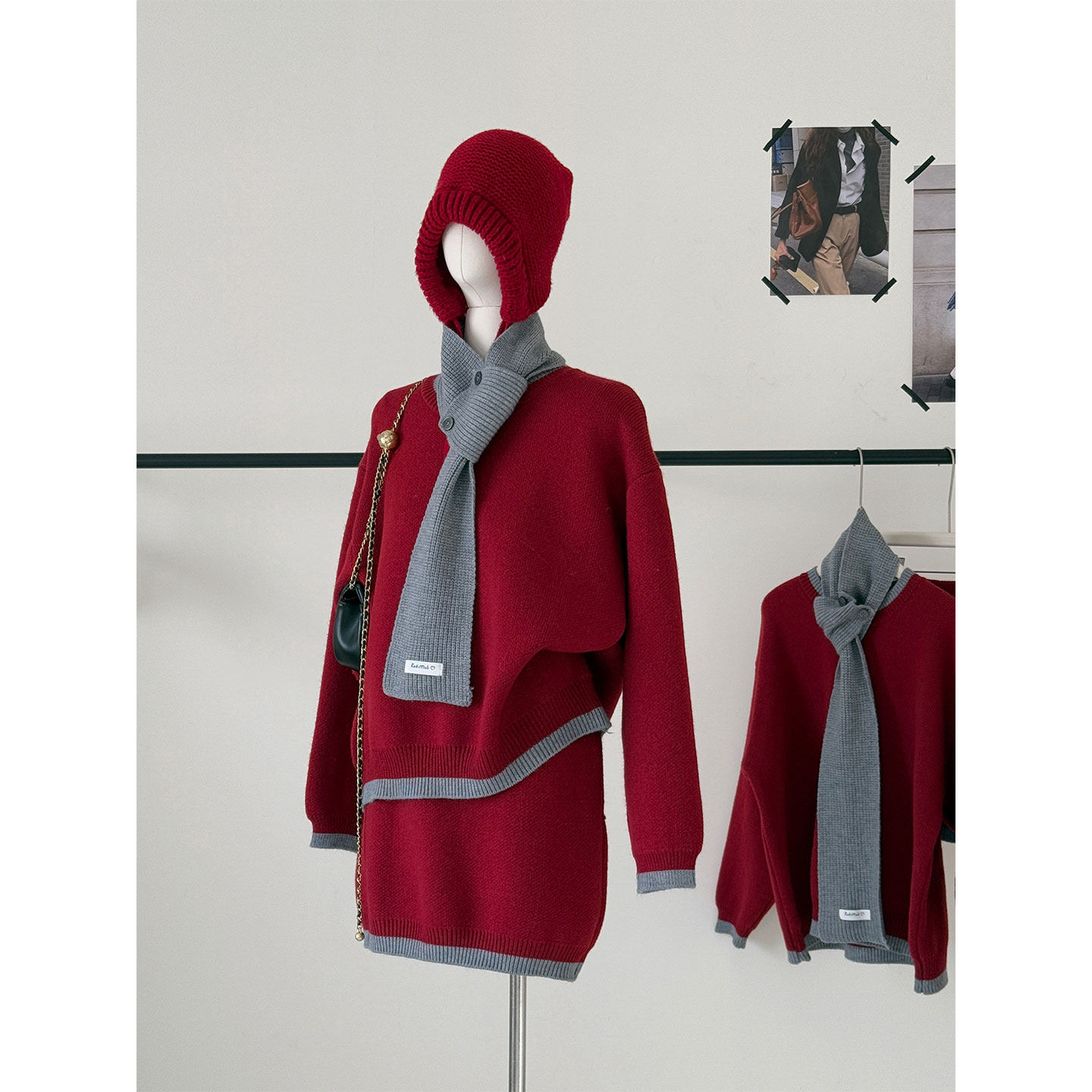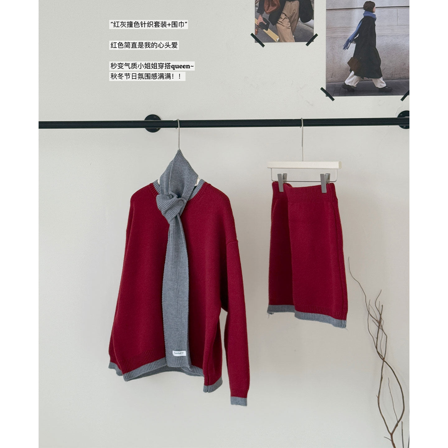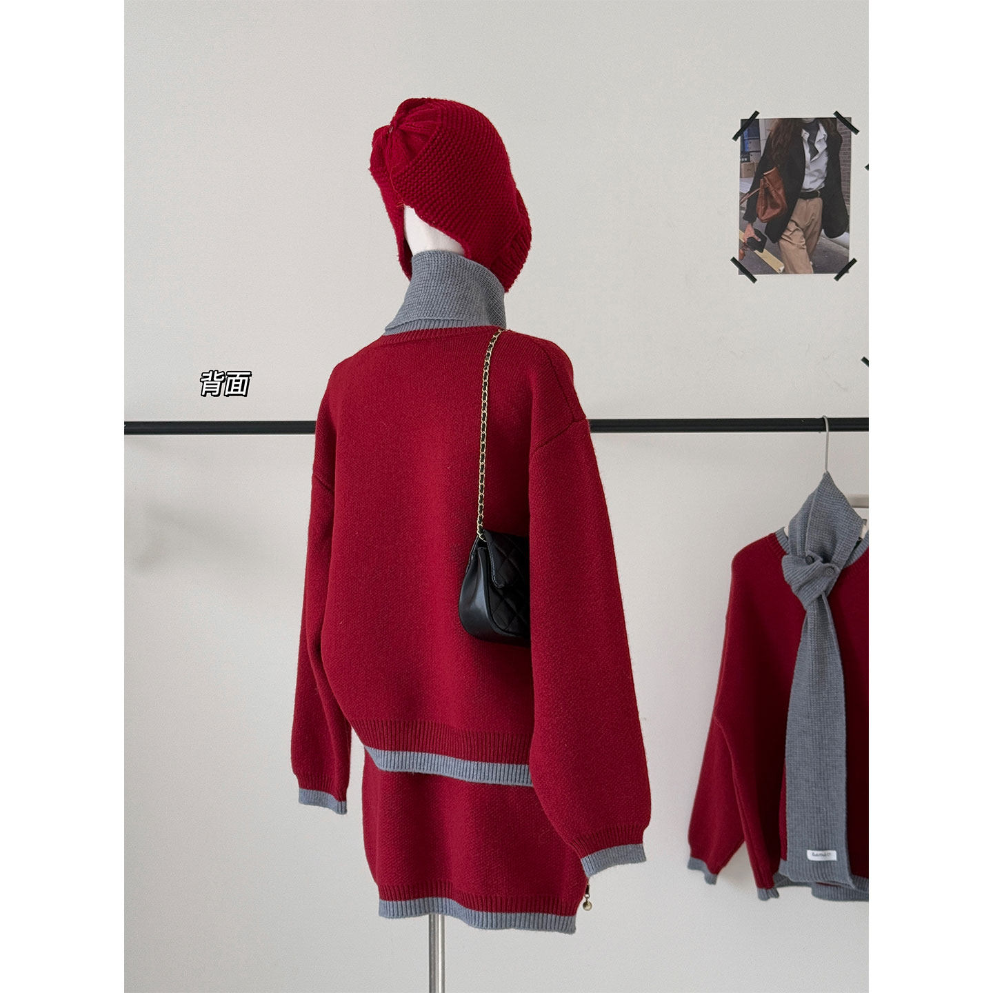 针织短裙ootd穿搭 红色毛衣女 超好看深冬装 一整套慵懒风撞色厚款