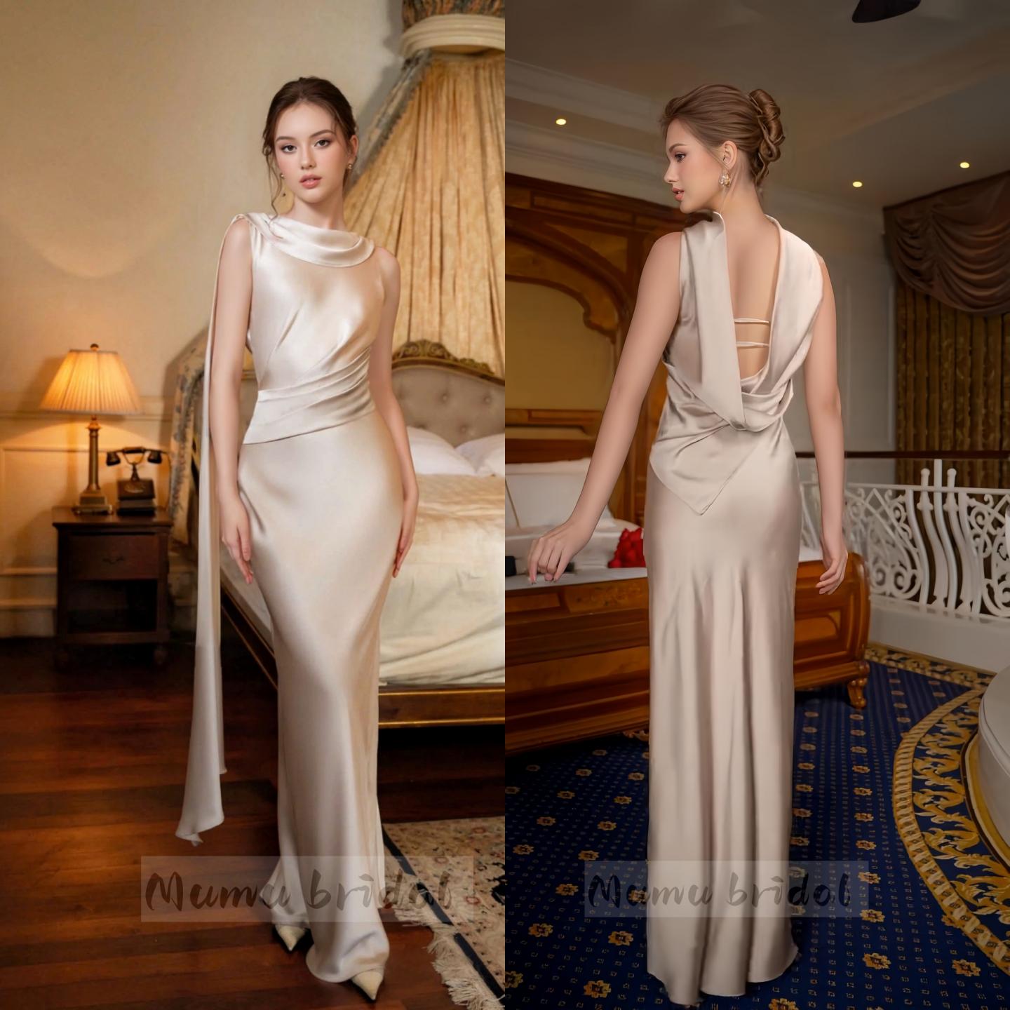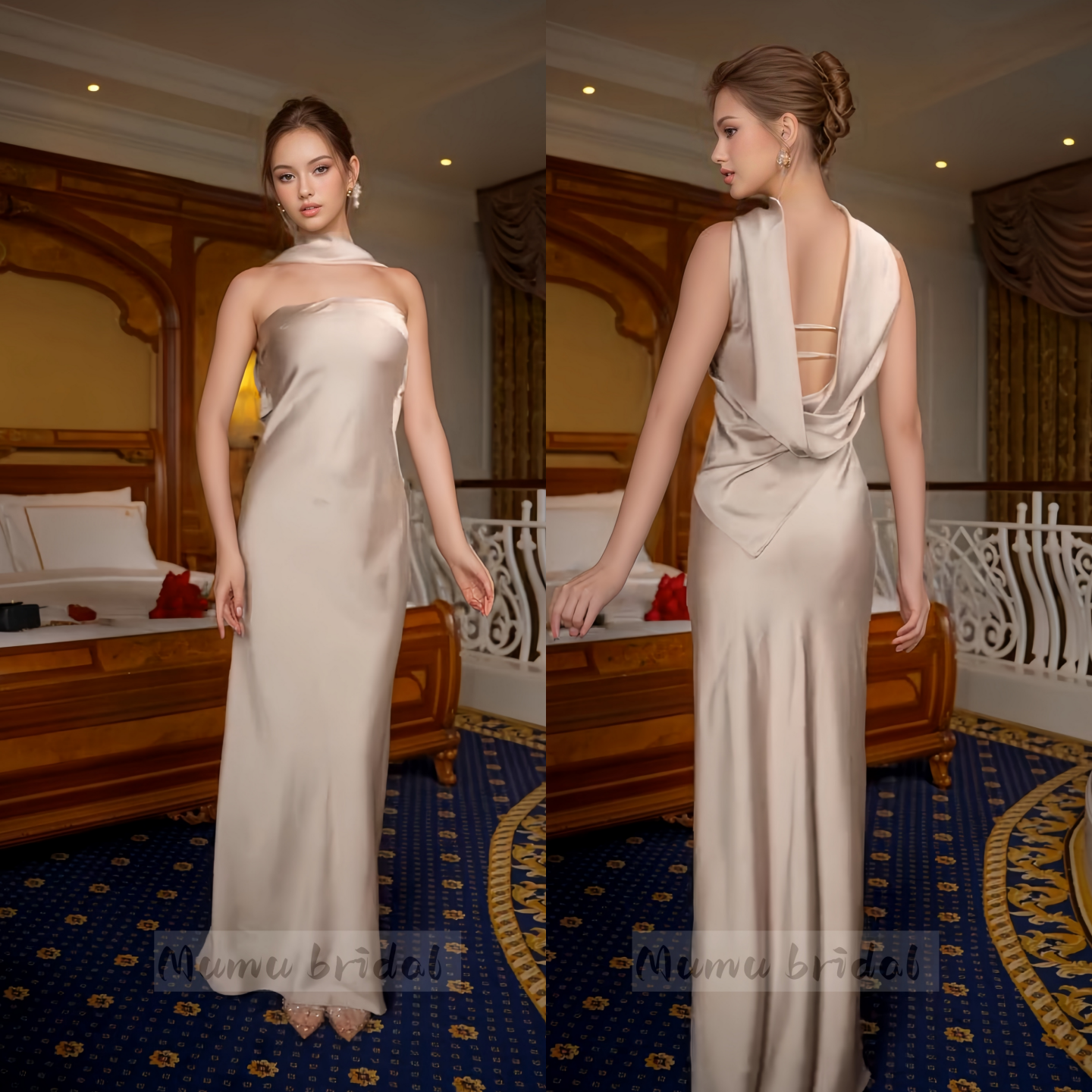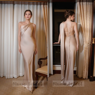 绝美香槟色缎面伴娘服日常高级小众姐妹服伴娘团伴娘裙生日礼服
