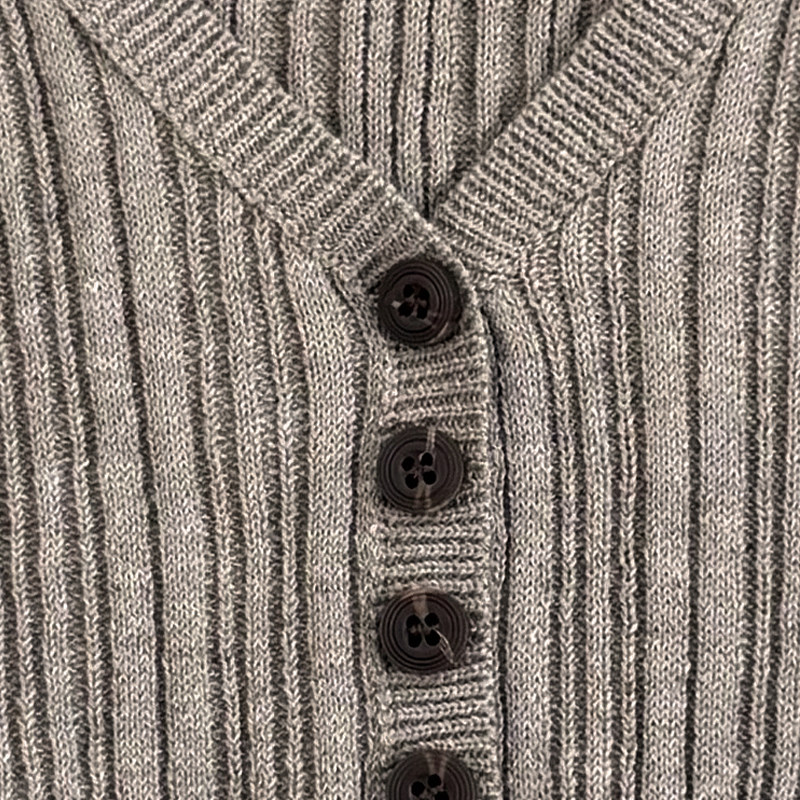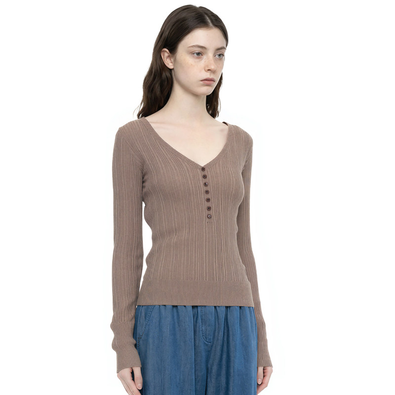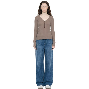 美式 显瘦极简打底衫 复古浅棕色V领扣子针织衫 修身 新 女长袖 BM上衣