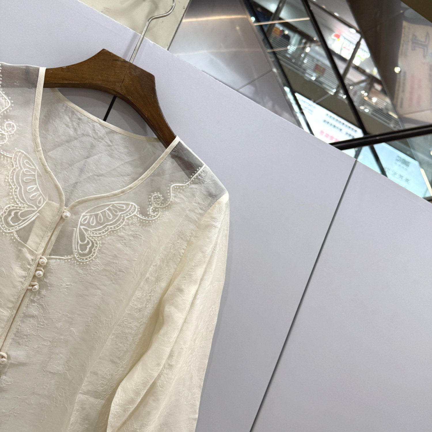 JD792欧洲站26春单排珍珠盘扣设计感高端桑蚕丝提花显瘦国风衬衫