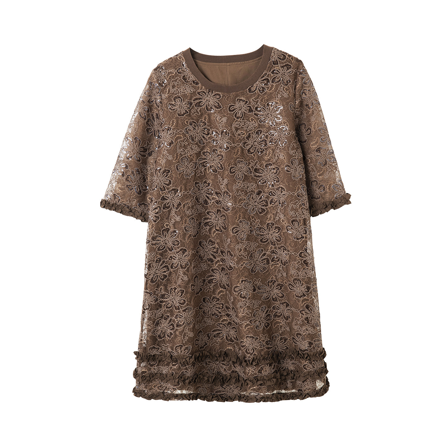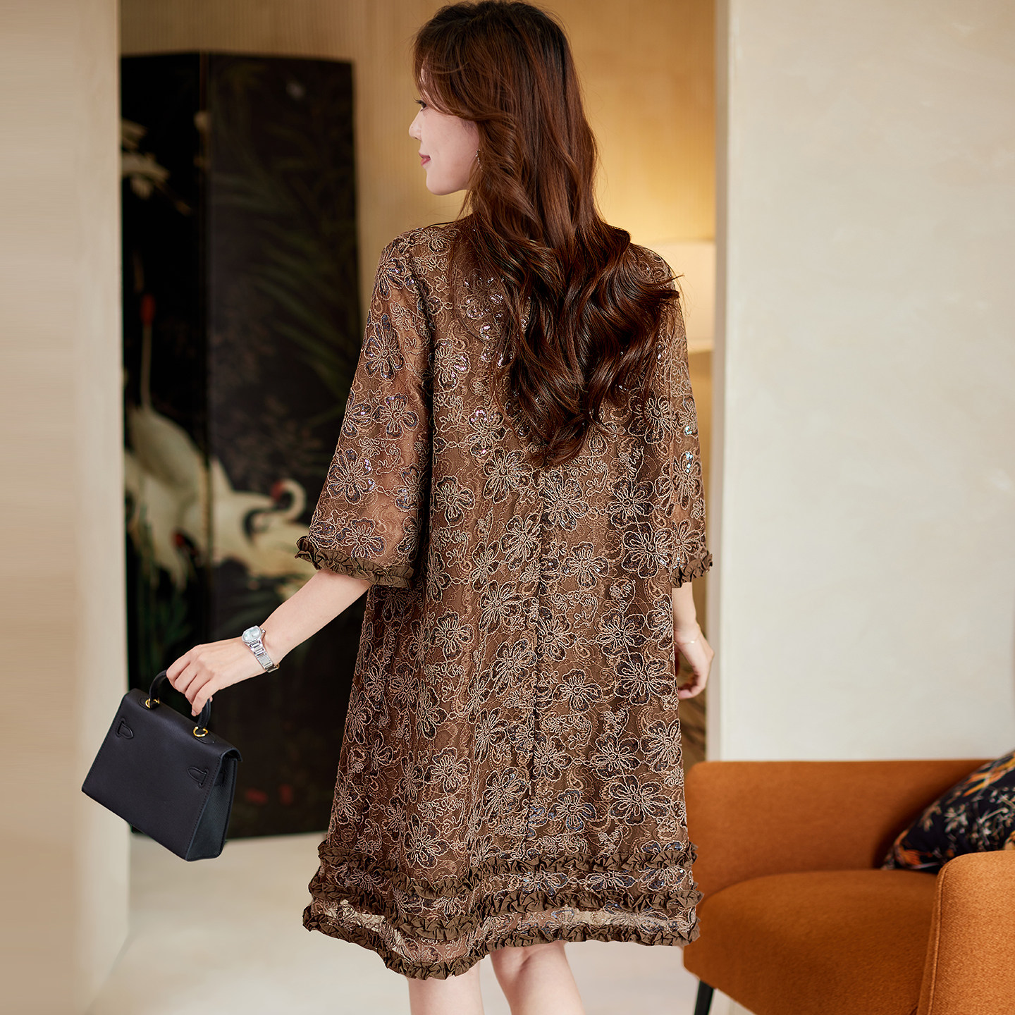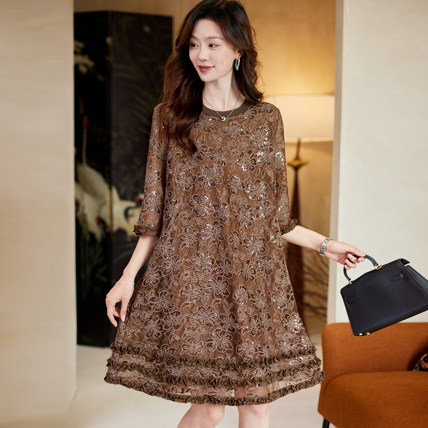 宝诗黎重工七分袖 气质宽松复古休闲直筒裙 亮片蕾丝连衣裙2026春季