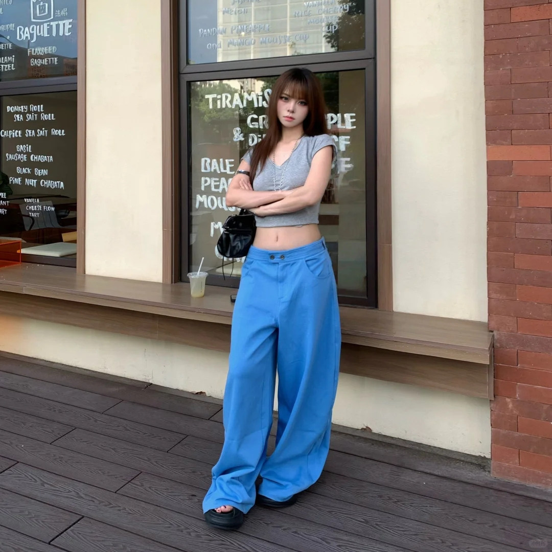 女秋季 方腰褶裥休闲裤 蓝色松弛感阔腿裤 简约长裤 theissn宁司