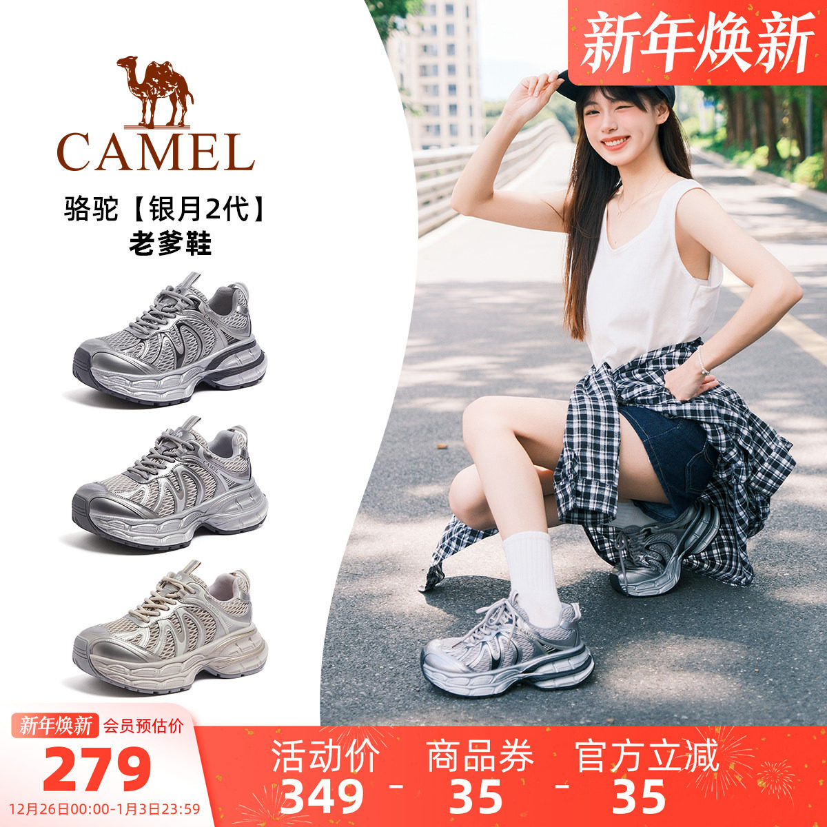 迪丽热巴同款 新款 骆驼银月2代老爹鞋 2025秋季 加绒运动鞋 女鞋