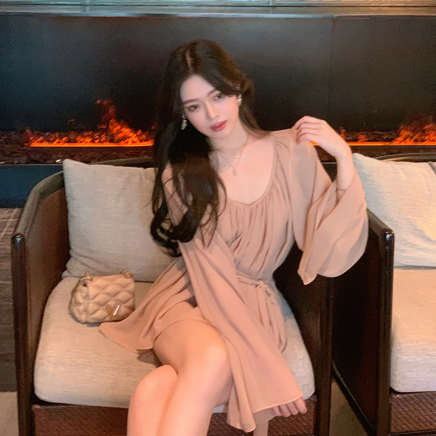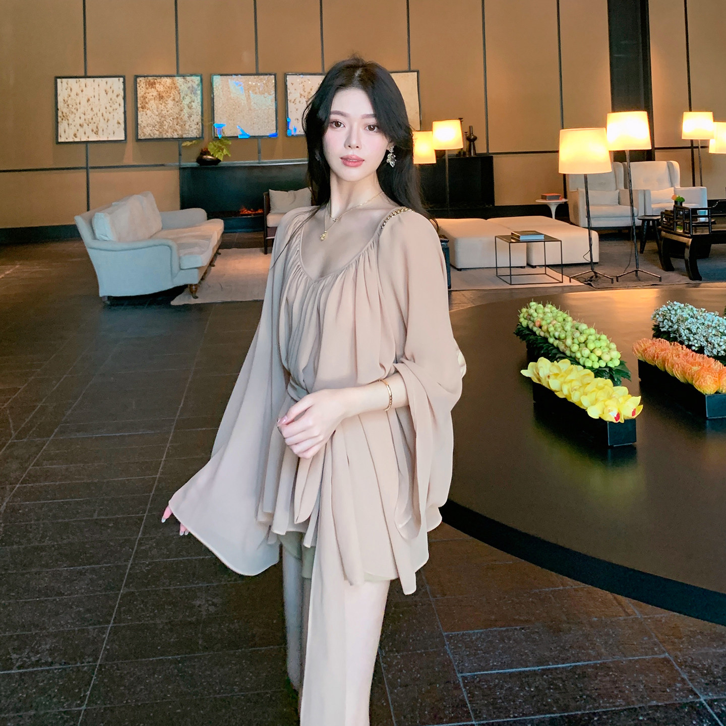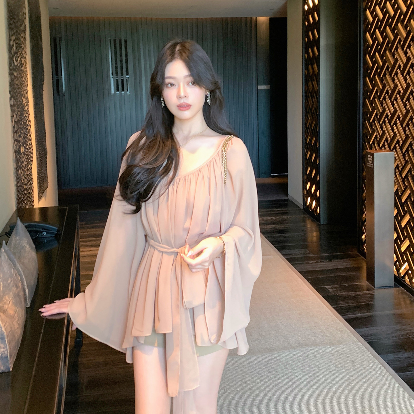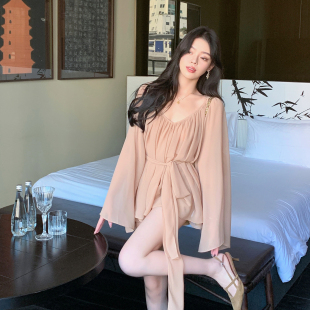 女不规则下摆绑带收腰衬衫 ByYou春季 V领雪纺衫 粉色喇叭袖 上衣 新款