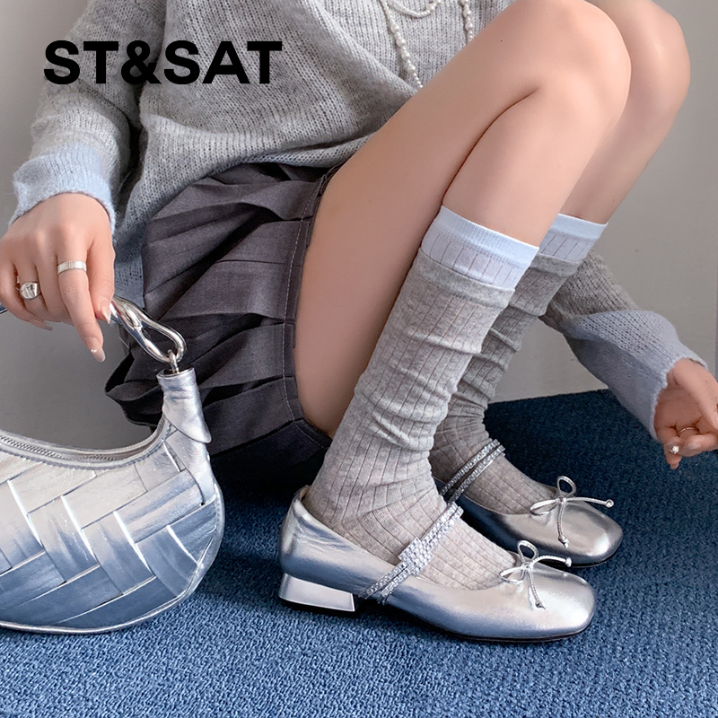 蝴蝶结芭蕾鞋 方头浅口水钻粗跟单鞋 女2025法式 星期六平底玛丽珍鞋