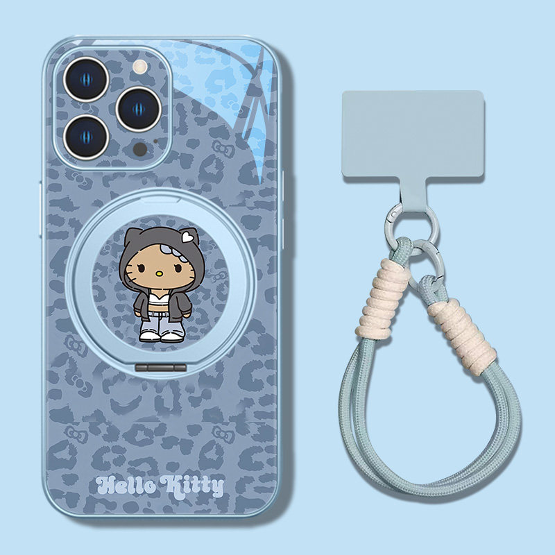 带挂绳HelloKitty磁吸手机壳适用苹果17系列 16自带支架手绳iPhone15plus黑皮凯蒂猫14豹纹13promax指环扣12